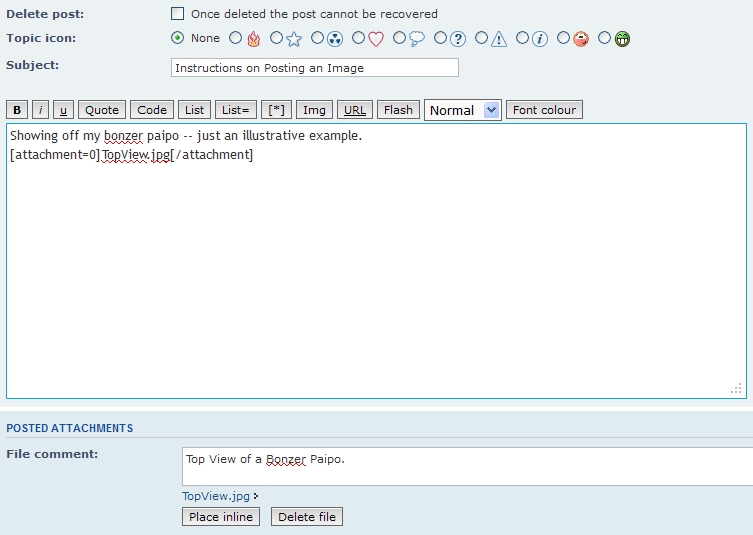 Step 1. Once you have decided to post an image from your computer, in a new message post or a reply, proceed normally and then look at the bottom of the posting screen for the three tabs, Options, Upload attachment, and Poll creations (see below). Step 2. Select the "Upload attachment" tab. Then click in the filename box or the browse tab. Doing this will open your file manager dialog box. Step 3. With the dialog box open, browse to the folder containing the file you wish to post and select it and then follow the normal procedure for completing the selection (in the image below using Windows XP, it is the Open button). Step 4. To load the file into the forum posting you then click on the "Add the file" button. Step 5. Make an optional file comment in the "File comment" box of the posted attachments section of the post. Step 6. Add text to your posting if you have not done so already. Step 7. Post your image and comments by clicking on the standard "Submit" button. Resulting post is shown below. Step 8. An "Inline Attachment." Using the "Place inline" feature provides more control for image placement in your posting. Clicking on "Place inline" puts code in your posting that has your file name with two bookend "attachment codes." This enables you to change the order of several image attachments in your post by cutting and pasting ("moving") the code around. You probably won't have that control with simple posts as done above in previous steps. Step 9. The final result is shown here. (This post actually consists of 9 inline attachments with text comments above each image.) Posting an image from an Internet Link