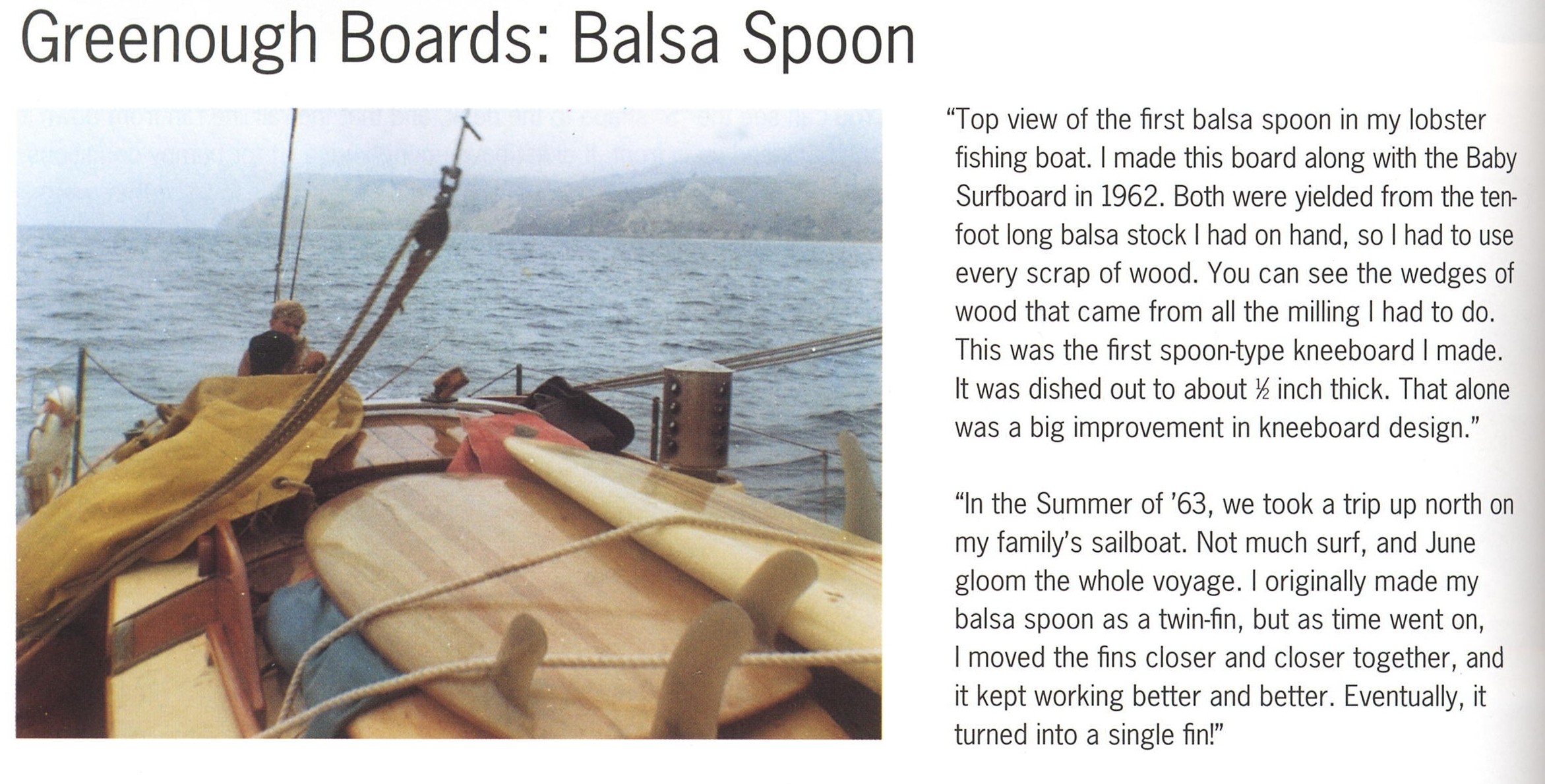 Coincident with Wegener's post, check out The Surfer's Journal, vol 07 no 04, pp84-87, where Greenough moves away from wood and twin fins to fiberglass/foam and a single fin, and eventually to the infamous Velo. Greenough also mentions how he started out with a twin fin, kept placing the fins closer and closer together and that eventually they merged into one flexible fin.