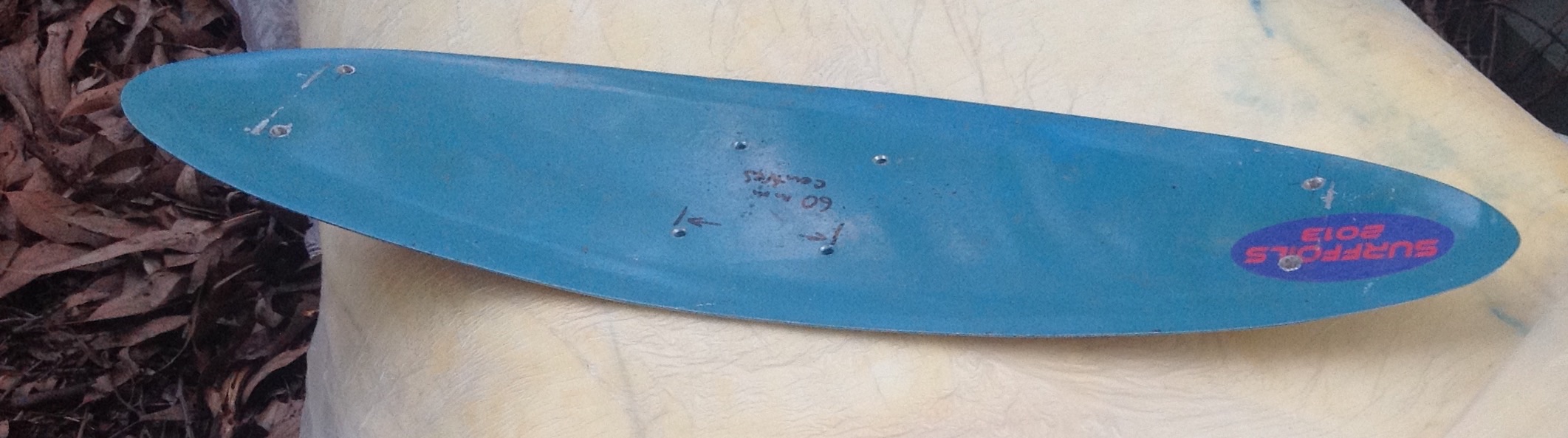 The aluminium struts are 3 mm Aluminium I make myself but some of the larger Aluminium foils I get made for me. And I just screw the struts into the wood on the board. Really basic and I've always thought I'd lose a foil in the surf but never have.