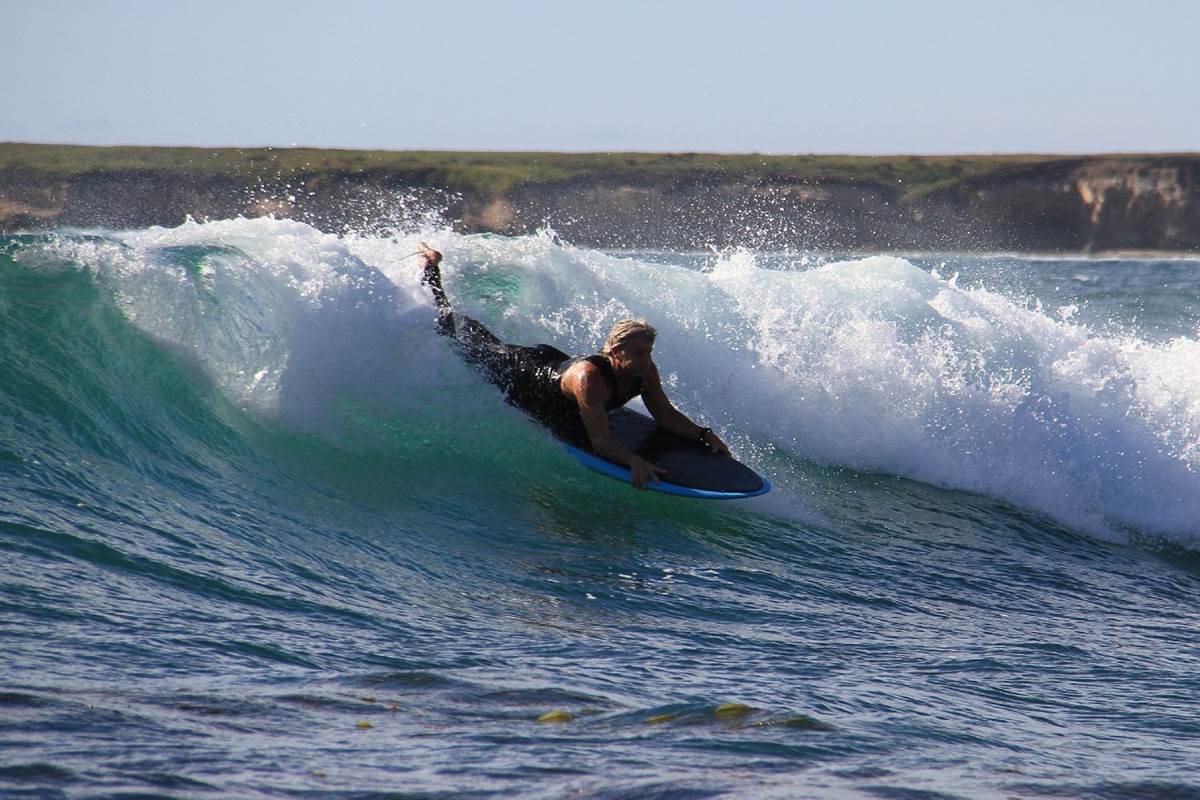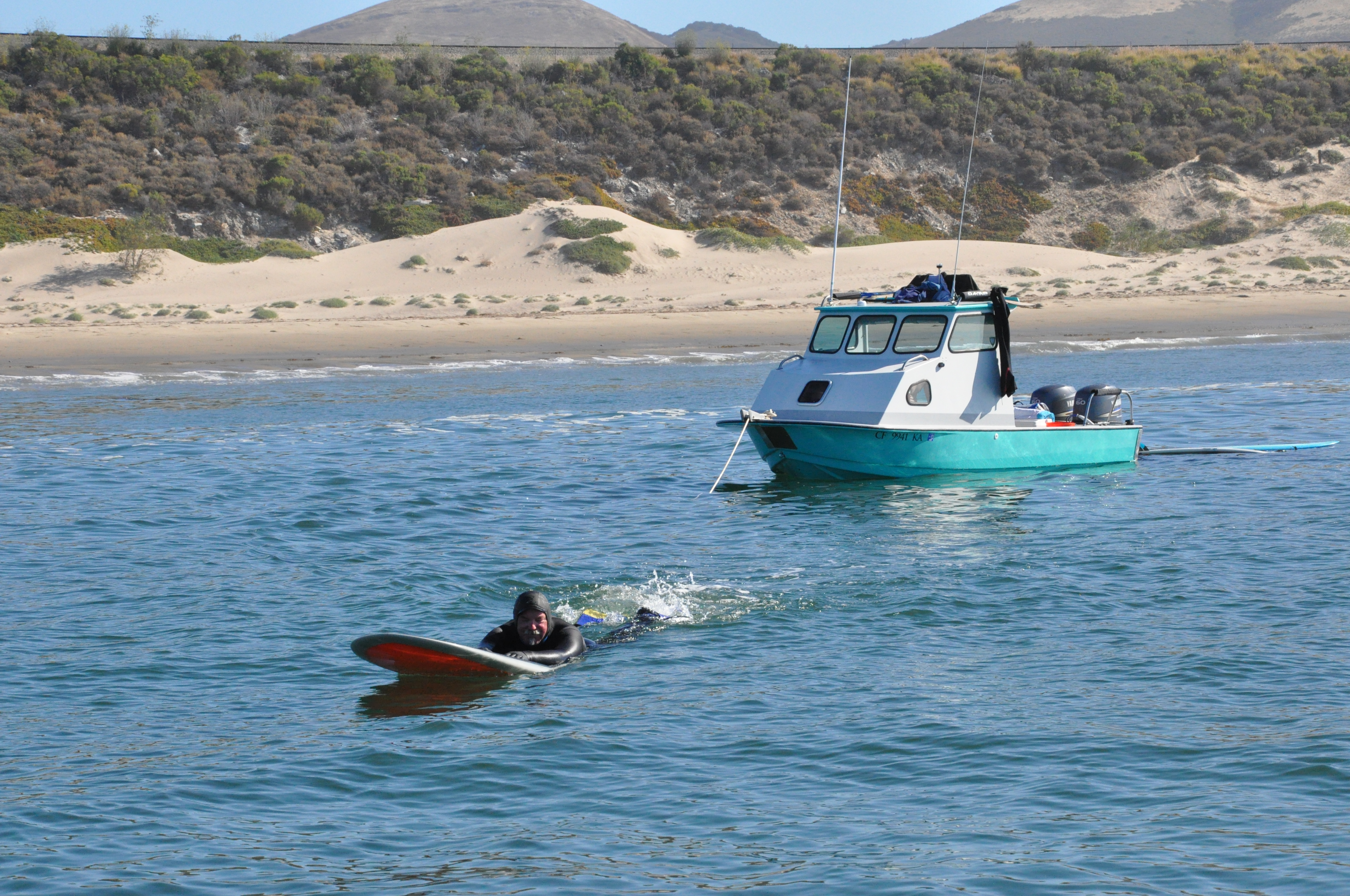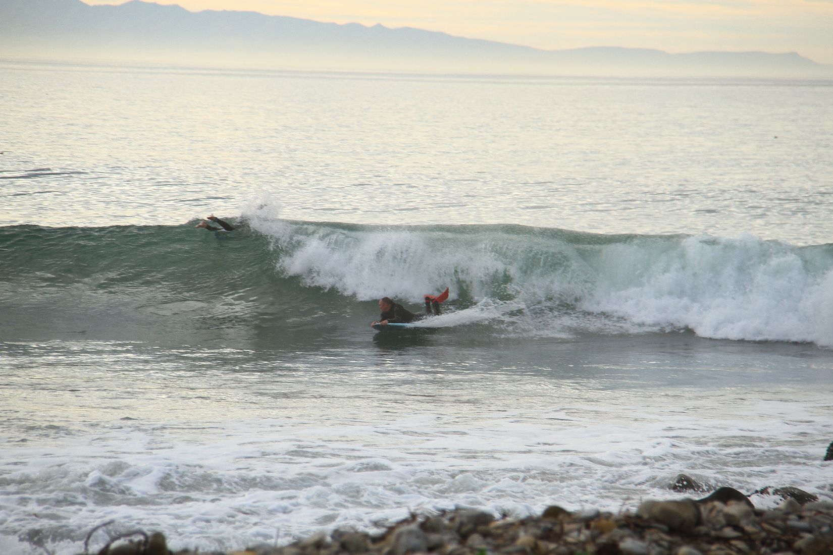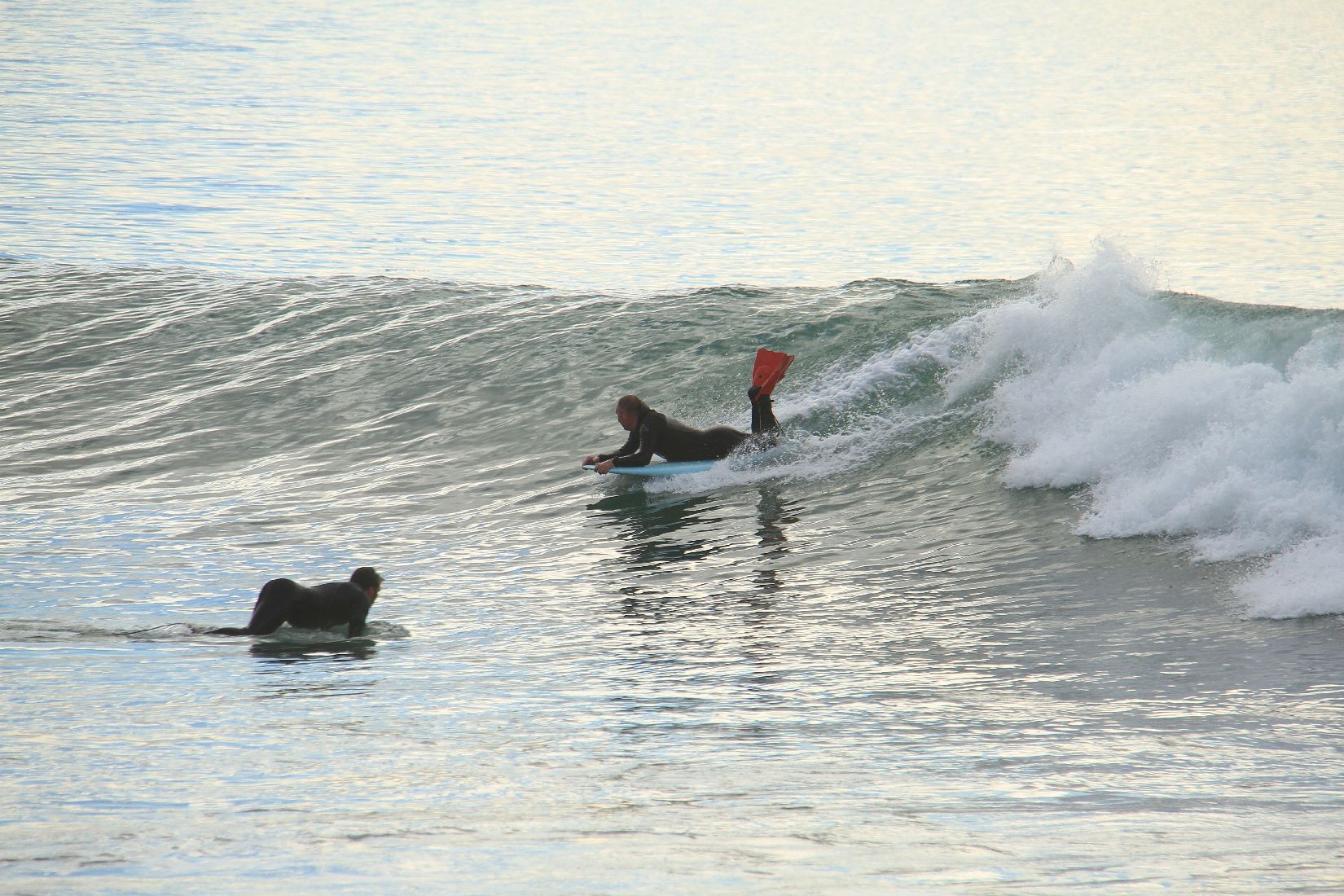 Sam wasn't wearing any for this, he just jumped in for a quick 30 minute session and didn't wear any. That's just him................for me? I wouldn't consider not wearing my Da Fins, from my 'research', they're an integral part of the whole experience. The boards have tremendous floatation (73 liters...), but they don't seem to want to paddle well with 'just' your arms paddling. I always just hold on to the tailblock with my fingertips for paddling back out, kicking methodically with my fins, and then, while catching a wave? I kick AND use my arms to paddle into them, and that combo seems to work best for me.