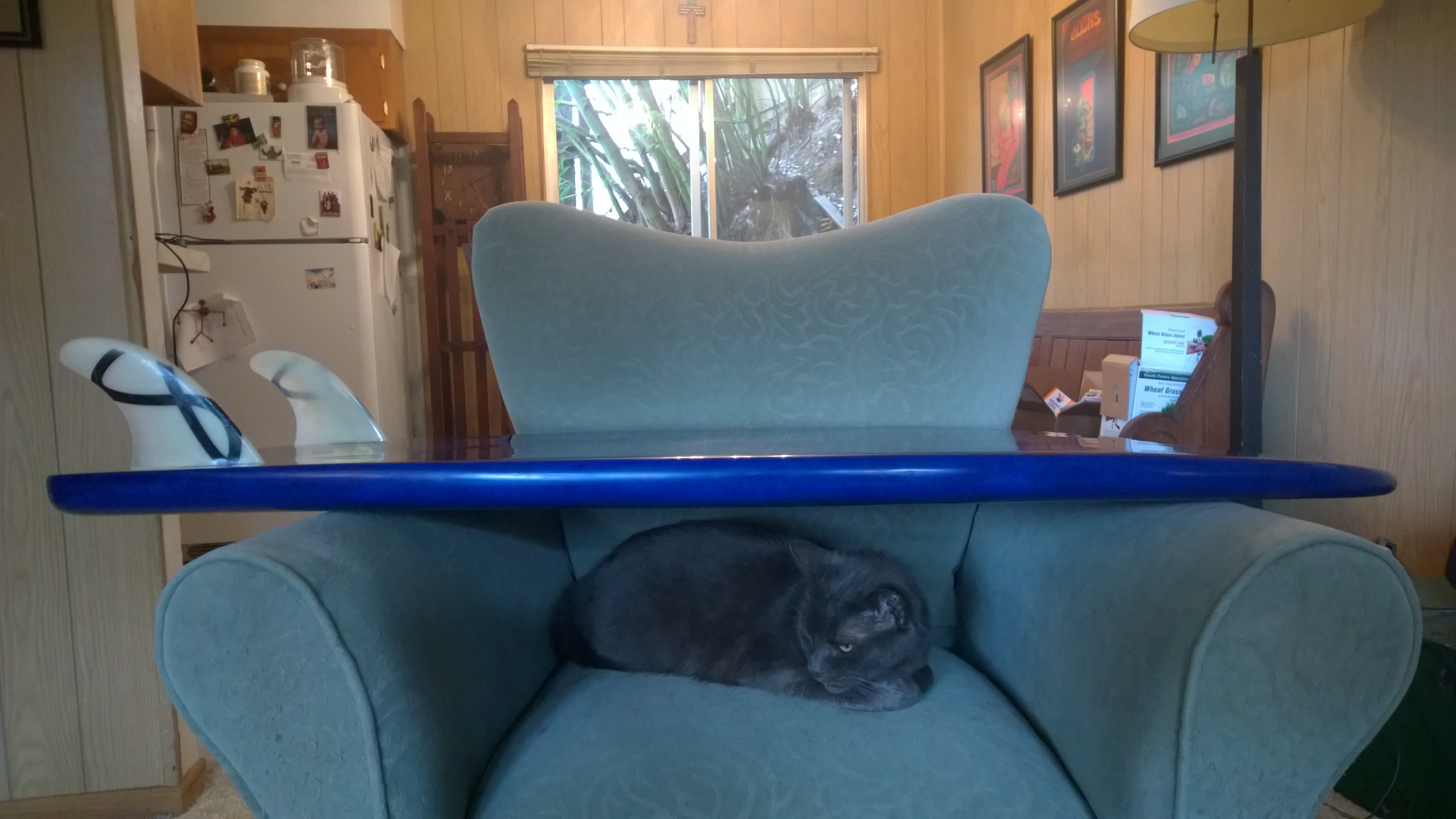 Here are some photos of my latest board. Hopefully the photos aren't too big. The specs are 51 1/2" long, 21" wide, 1 3/4" or so thick. It is epoxy with 3 layers of 4 oz top and bottom. I am planning on putting a Cove pad on it --either 3/16" or 5/16". But first I am riding it awhile without a pad. I rode it in some decent surf on Sunday at Ocean beach in SF and some crummy surf the day before. It seemed to ride great.