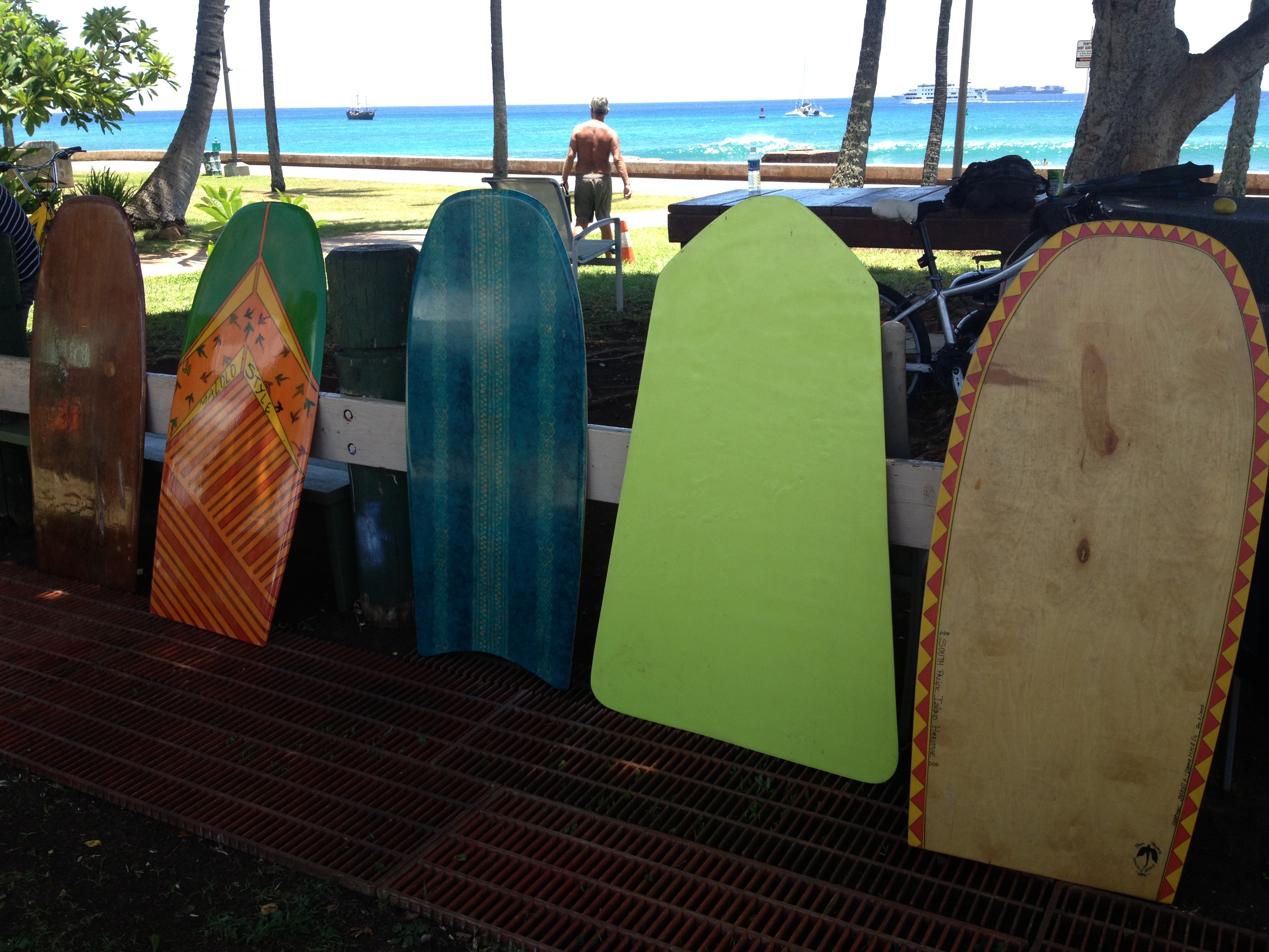 My name is Jarrett K. Liu from Kaimuki,O`ahu. I've been riding multiple sizes of paipo (Papa Paepo`o) boards around Hawaii`i. Now I'm shaping my own style and shapes for my bodysurfing buddies and others who love to have there very own Paipo (Papa Paepo`o).My boards are made from mahogany wood with variable sizes that has nose rocker with a nose-contour. Boards height ranges from 32"- 50"inches, variable ranges in width 17"nose, mid 21", tail 19" . I just add or minus 2"inches of board per board design. Every boards has its own top deck (pattern) and the bottom deck had Hawaiian Prints (100% cotton material) that is laid under a 6oz. S-cloth on the bottom and 6oz. S-cloth for the top deck. Epoxy resin is used. These boards are finless and rides in "HIGH" surf meaning Makaha surf of 6'-8'ft surf to east-side 3'-4'ft. with no problem. Bottom tail does not whip-out while making the bottom turn, boards has a slight weight to give the rider a forward motion of getting the board down quicker on the face (drops). Boards are capable of riding with the riders control because of it's narrow midway to tail.