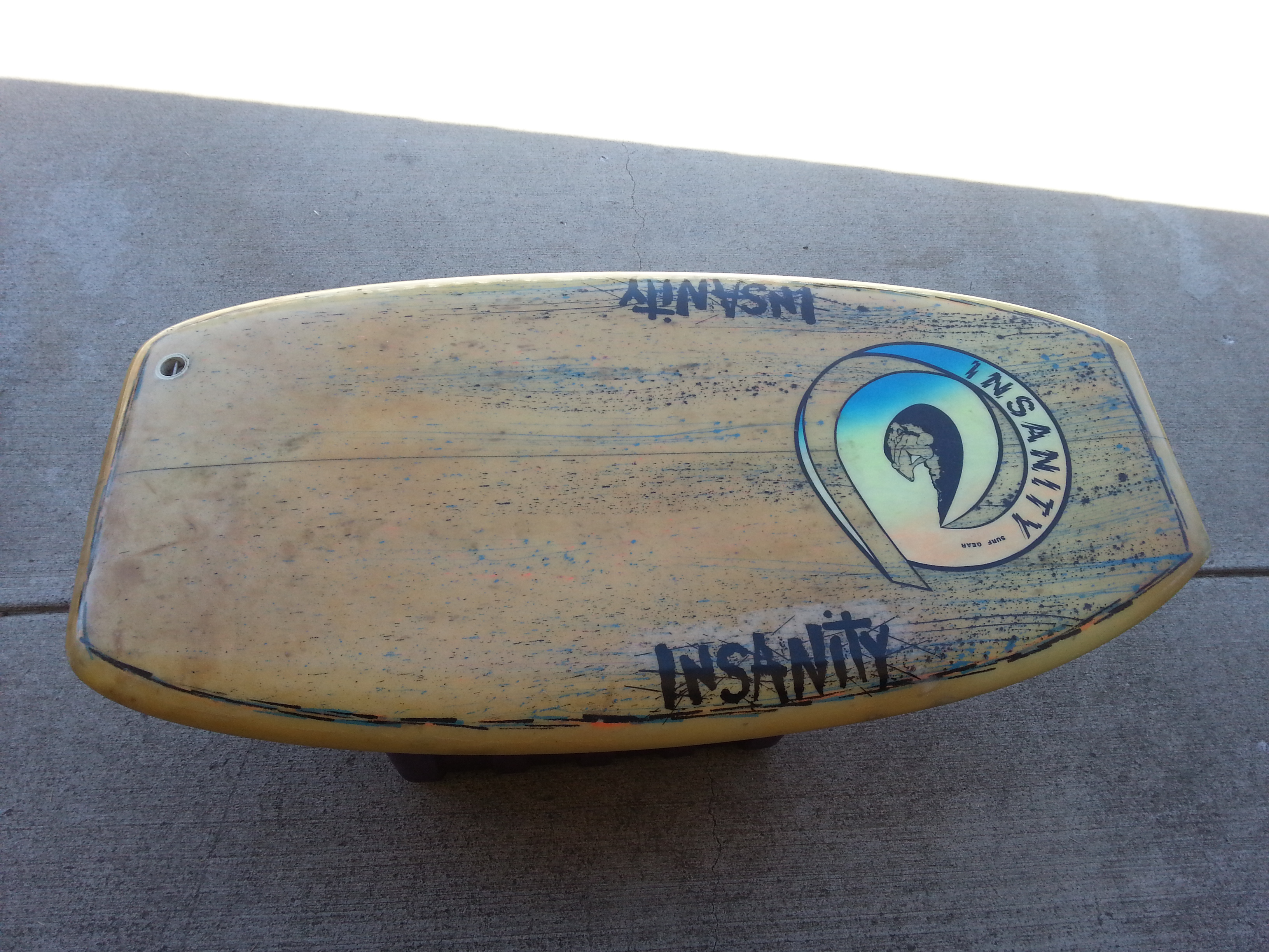 Some of you take the fins out of your board, and ride it finless. Then you're riding a finless board that was designed to be ridden with fins. I propose a different approach to fins vs finless comparisons. Start with a board that was designed to be finless, and then add fins. Pictured below is a fine example of finless technology from the end of the Cold War Era. It has drop rails and a poop chute channel at the tail, all highlighted by black airbrush.