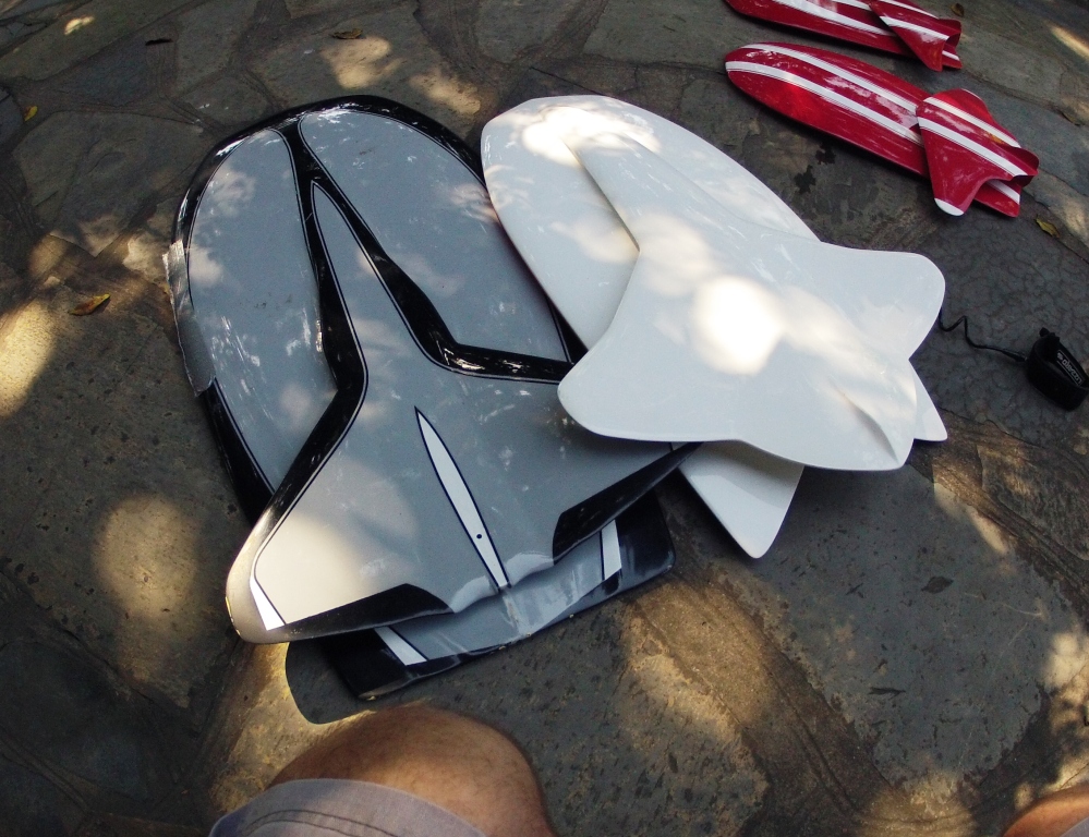 The glassing is finished, the strut s have finished well, and the idea on this one is to clean up the water flow between the split decks. The final sanding has revelled some pleasing lines