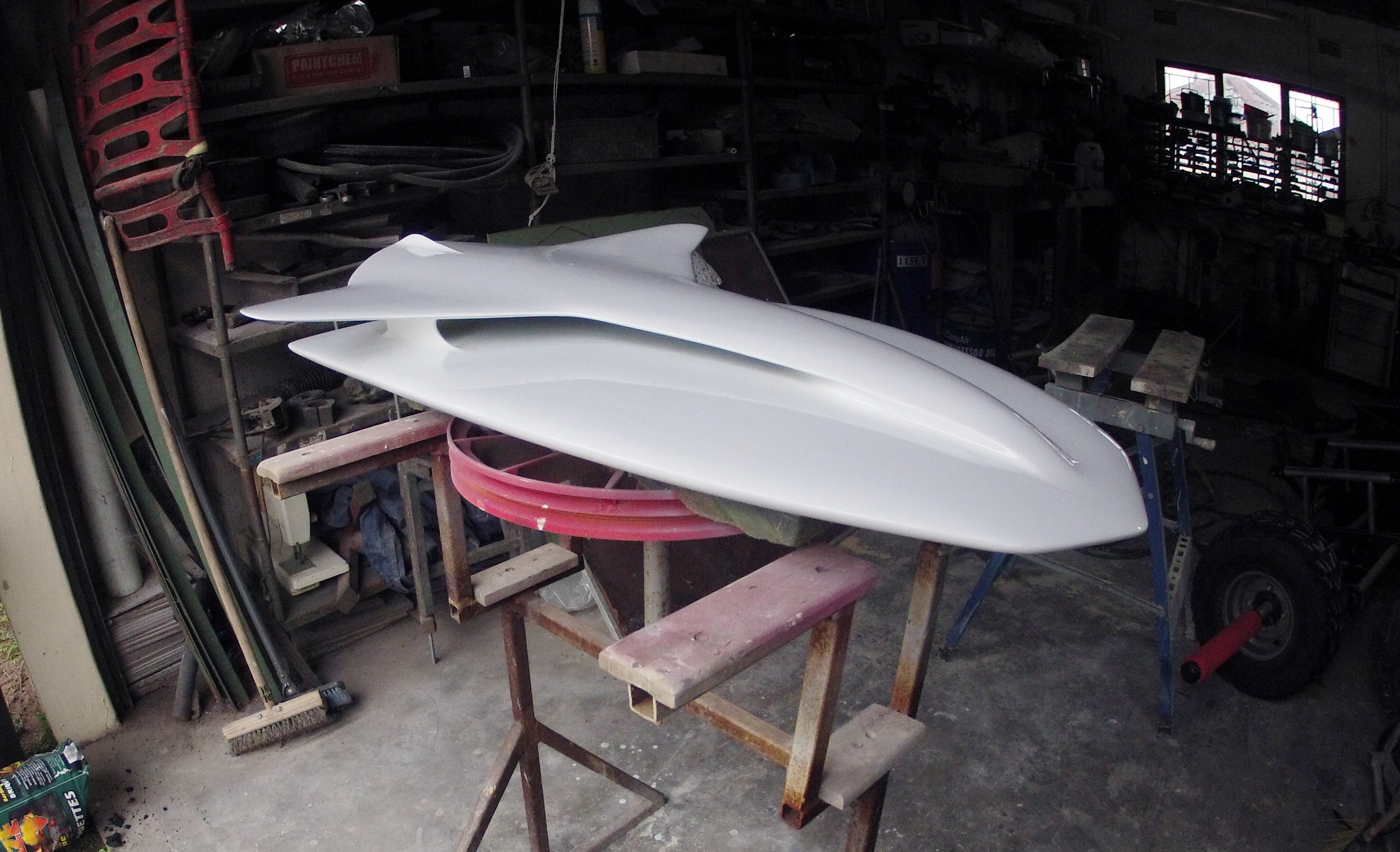 The glassing is finished, the strut s have finished well, and the idea on this one is to clean up the water flow between the split decks. The final sanding has revelled some pleasing lines