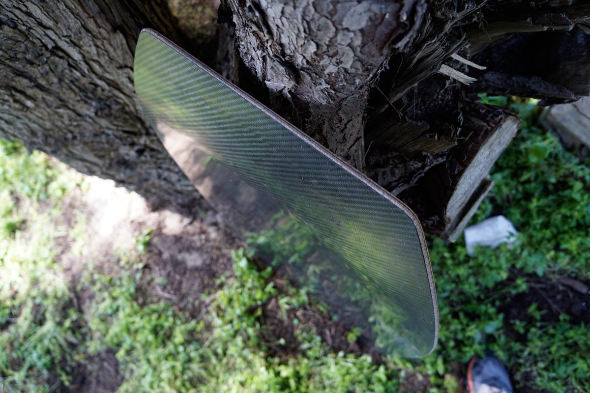 The second design I'm calling the Bodypo Blade. No fiberglass in this one - all carbon fiber. It's very thin, just 1/4" thick with a full rail-to-rail and nose-to-tail concave. It's about 3lbs — comparable to a foam board. Just above neutral buoyancy. Wooden paipo lovers are going to flip their lids on this board, it's super cool. It feels a lot like bodysurfing. Very fast and smooth. I haven't really released this board for sale yet, but people keep insisting on buying my prototypes. It's a pretty cool looking board with exposed cork on top and carbon fiber on the bottom. I'll have a couple of these with me for the demo days, so come check them out.