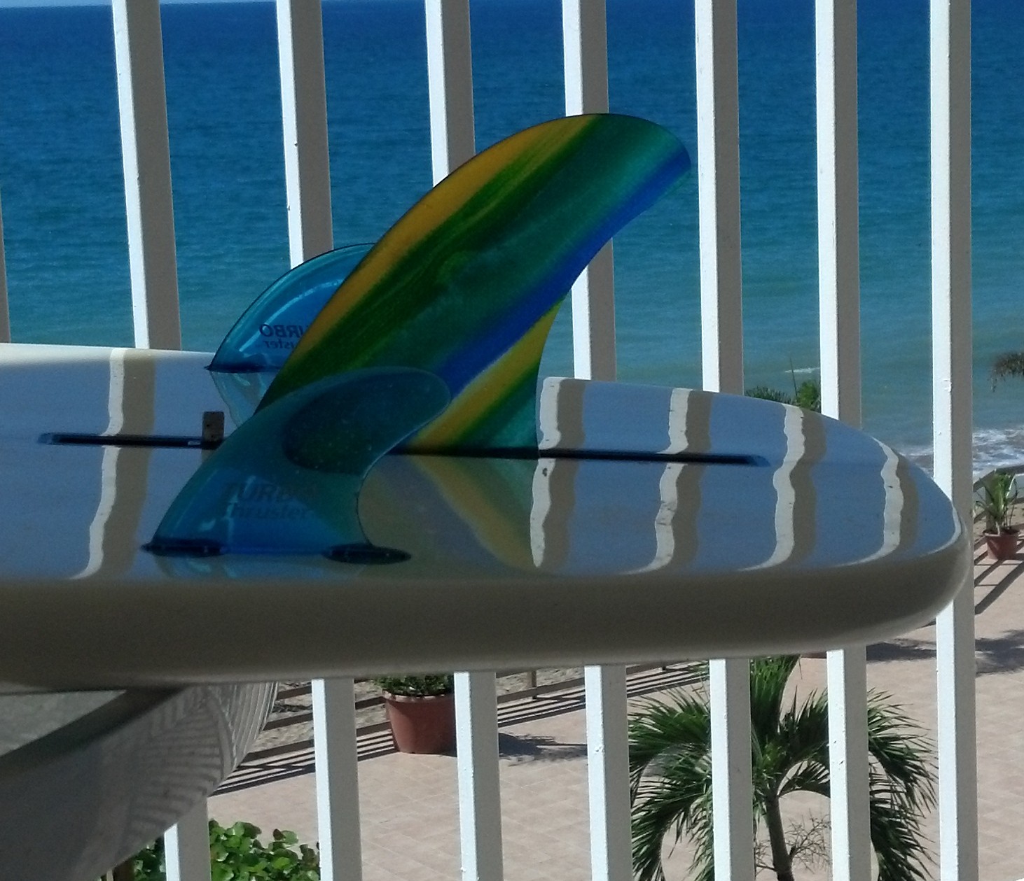 I checked the measurements and shot a couple of pics. The center fin is 5" and the trailing edge is just over 3" from the tail.
