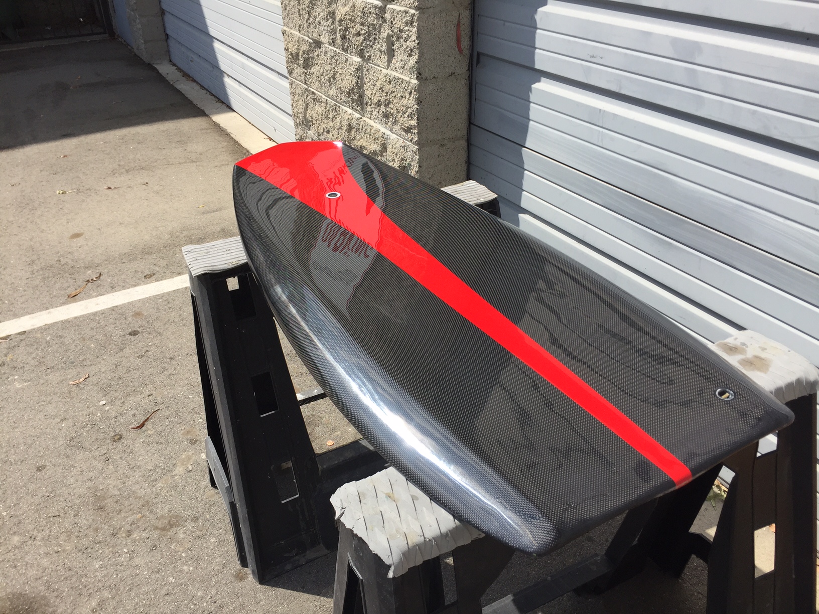 ), I picked up the G5 at my glasser's. All I can say is "well worth the wait". I opted for the red accent because the bottom contours, when sheathed in carbon fiber, reminded me of an F1 race car, and the red added to that aesthetic. But red also because I'm growing weary of getting dropped on because people just don't see me coming. The photos below don't do it justice, as the black seems to absorb the shadows necessary to reveal the contours. But, I'm stoked at how the board turned out and can't wait to get it in the water.
