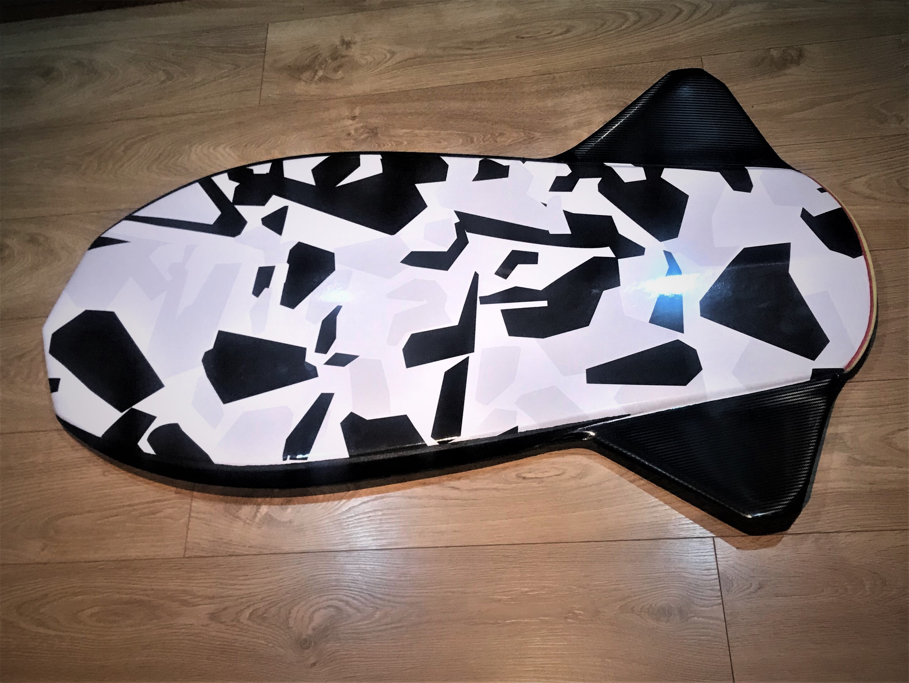 I still feel foils will give better lift to drag numbers than parallel to water flow rails .This is also an experiment with vinyl wrap, I don’t know how long it will stay on. Its 10mm Airex foam core with 20 mm top and bottom polyethylene foam plenty volume, the vinyl wrap is epoxy to the polyethylene foam