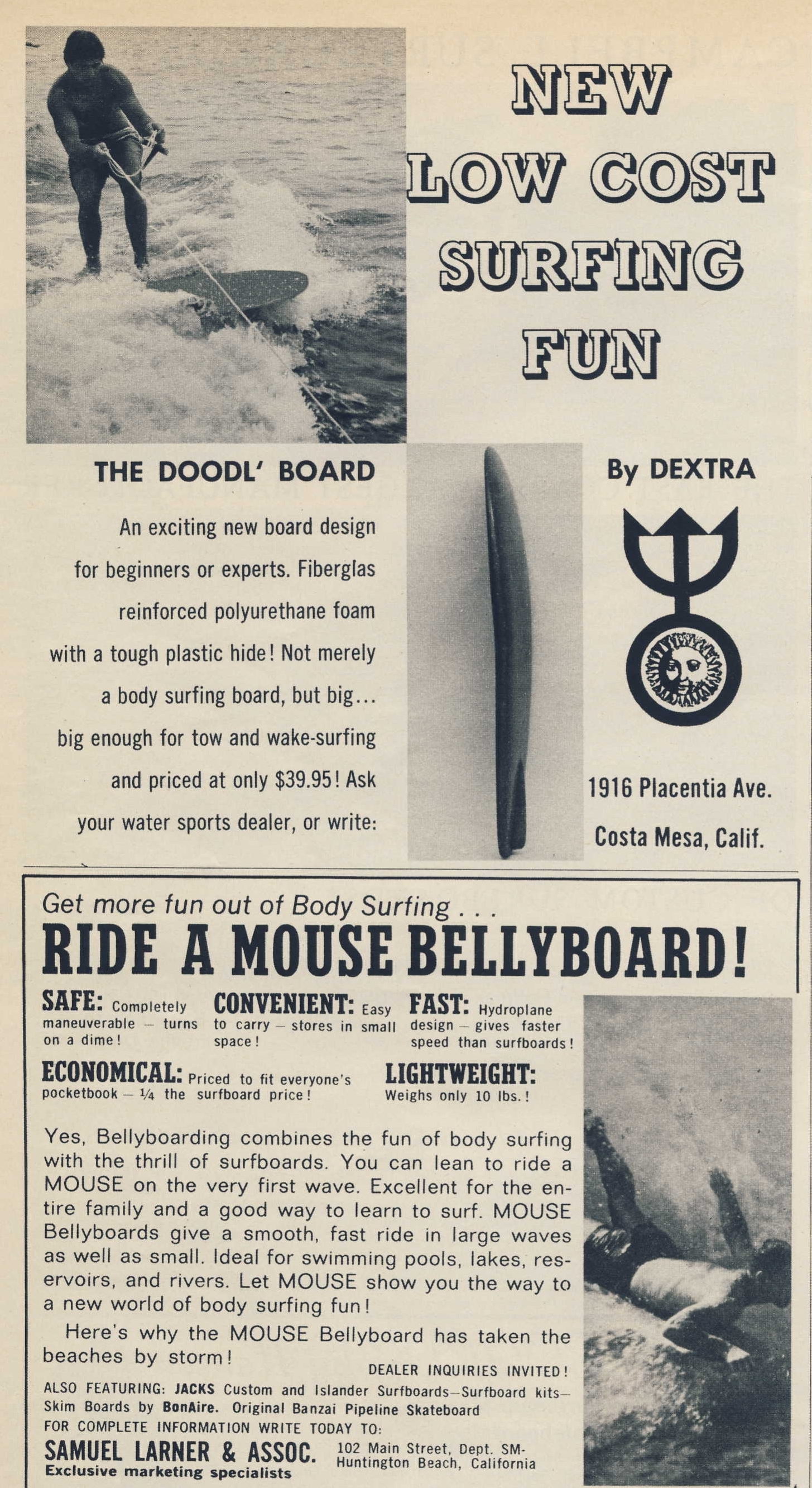 Petersen's Surfing Mag PSM 1964-Sep v01n07 p52 Dextra Doodl' Board. Marketed primarily as a towing and wake surfing board; also a body surfing board.