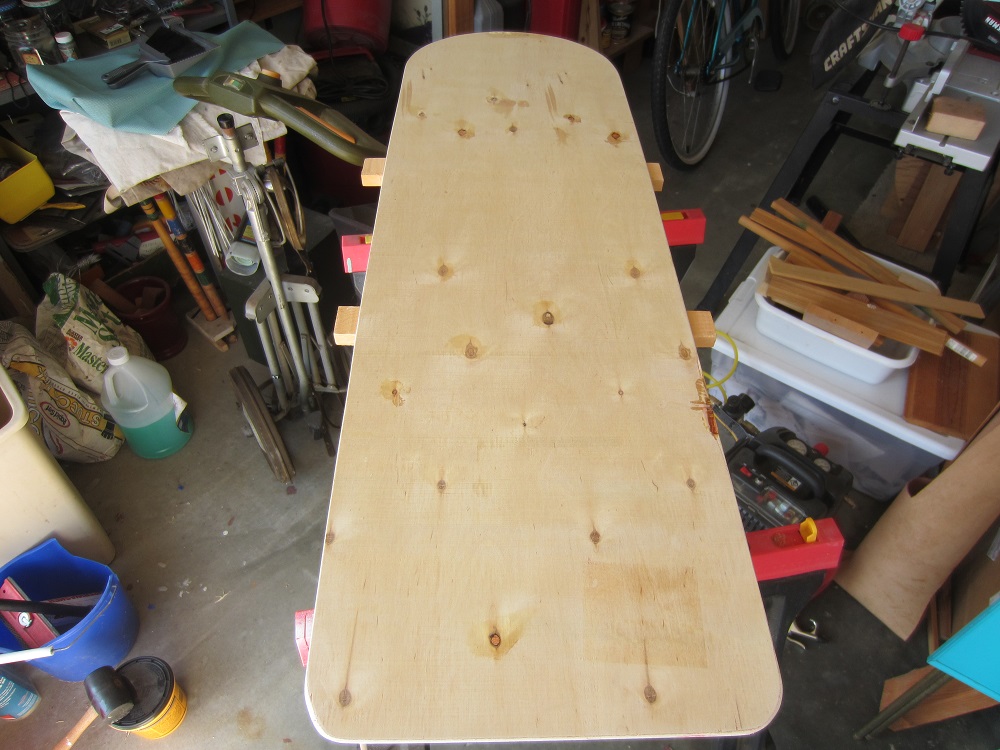 I know they usually have a nice bend in the nose. That would have been helpful here but I didn't think the thinner material would handle the steam or soak and dry. And I'm pretty sure I was right. But also I've found with 1/4" ply they can be bent up front as necessary to catch waves. This thing I made though, like a sea serpent. I missed on length too (scrap from the garage, right?). Mine was 40" long, which was fine for catching waves but at a threatening length given the undulation.