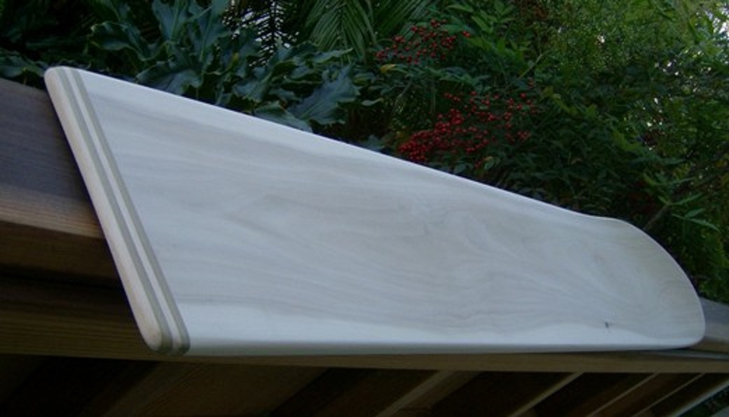 Ride report: One and done! I'll consider it "proof of concept". It got one session in. The actual ride, the design, was goofy fun. Surf was nothing special, beachbreak. I wore flippers but didn't need them. The ugly bit though...the narrowness of this design made the whole board flex and undulate while on the wave. That was a catastrophe. Like I said, I've done other boards with .25" ply, and that was never something I had encountered. I can only think the narrow nature of this design allowed the undulating flex. The usual 22" - 24" width on my other paipos seemed to protect me. Another downer was the flippers, trying to stand up while holding the thing was a bear in shallow water. Hard to explain, maybe. The final "learning experience" was with the ply. I'm done with .25" ply for anything more than maybe handboards. Also, no more playing with this lowest end. The undulating led to layer separation and water intrusion which I have never had happen on the wider boards but always expected. The board is toast. Pleasing to my eye, but toast.