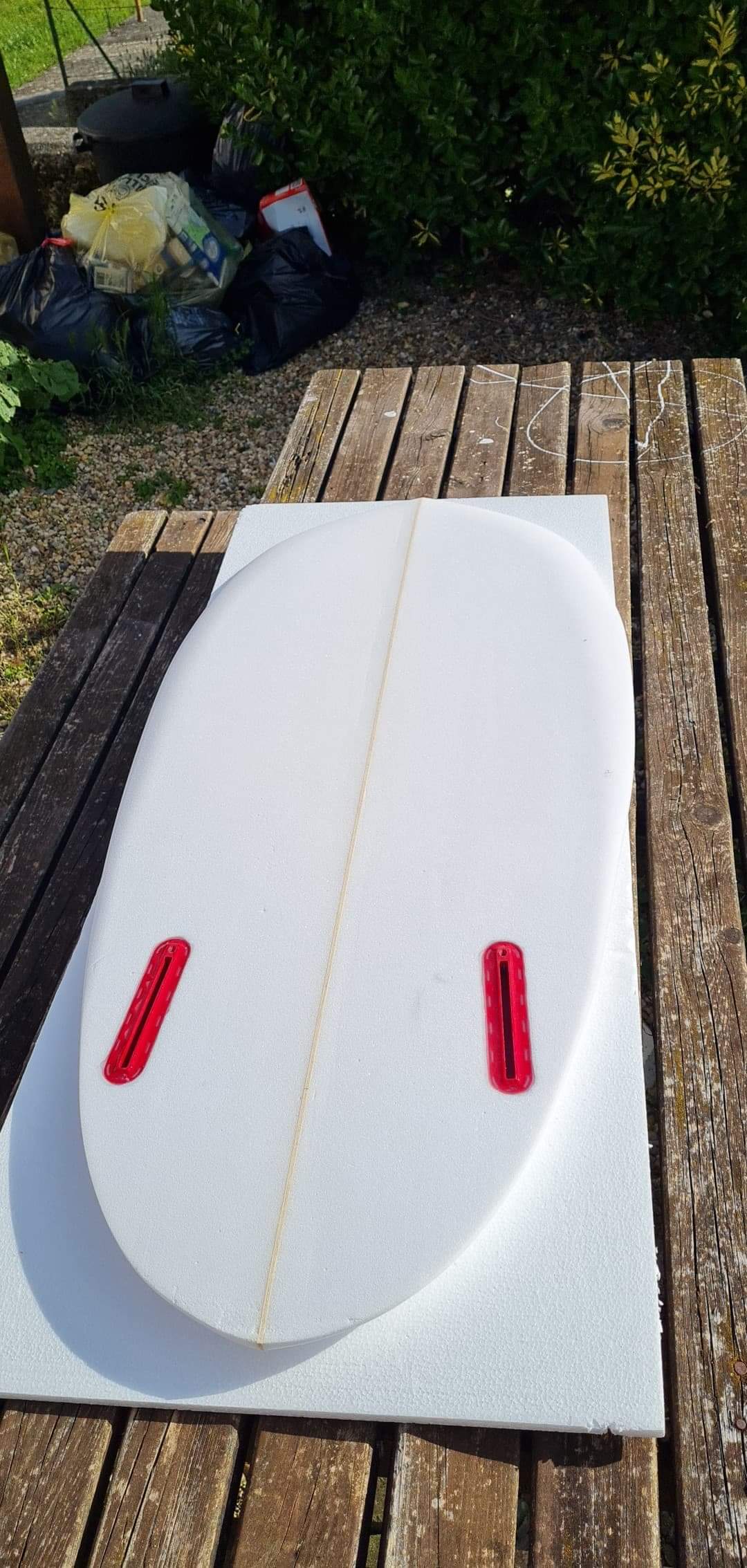 Here is the board before the sanding process (the last part) I already have a set of twin fiberglass keels that I will mount on this board.
