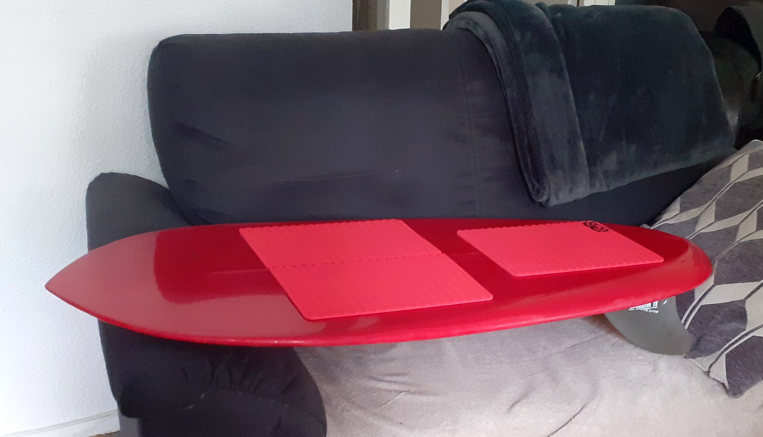 I tested the board, but it was too flat, the waves were too small. The good thing is that kneeboarding is easy on that thing, the shortness, the flat wide surface, it helps. The board has some floatation, which I am not used to. The keels fins seem too big for small waves. Next time I will use 2 classic thruster fins that I have, so I can compare.