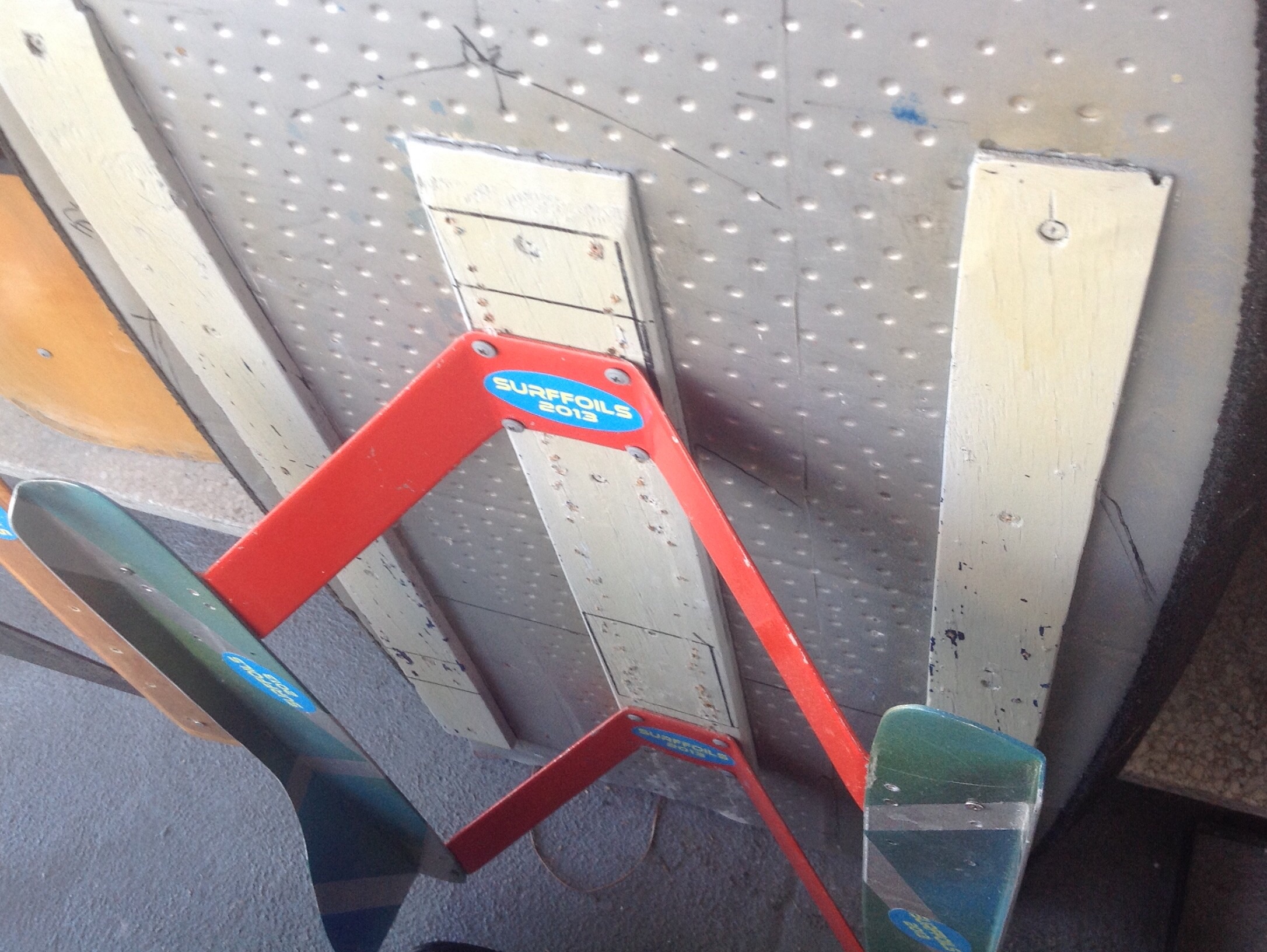 The aluminium struts are 3 mm Aluminium I make myself but some of the larger Aluminium foils I get made for me. And I just screw the struts into the wood on the board. Really basic and I've always thought I'd lose a foil in the surf but never have.
