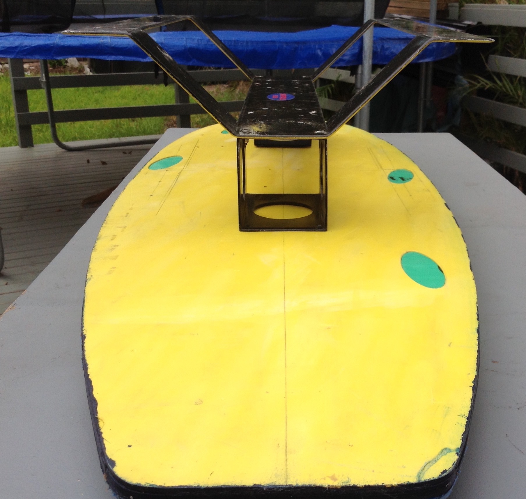 The second one is a standard bodyboard and I've put 3 strips of ply as strengtheners on the hull and deck and bolted them thru the board.