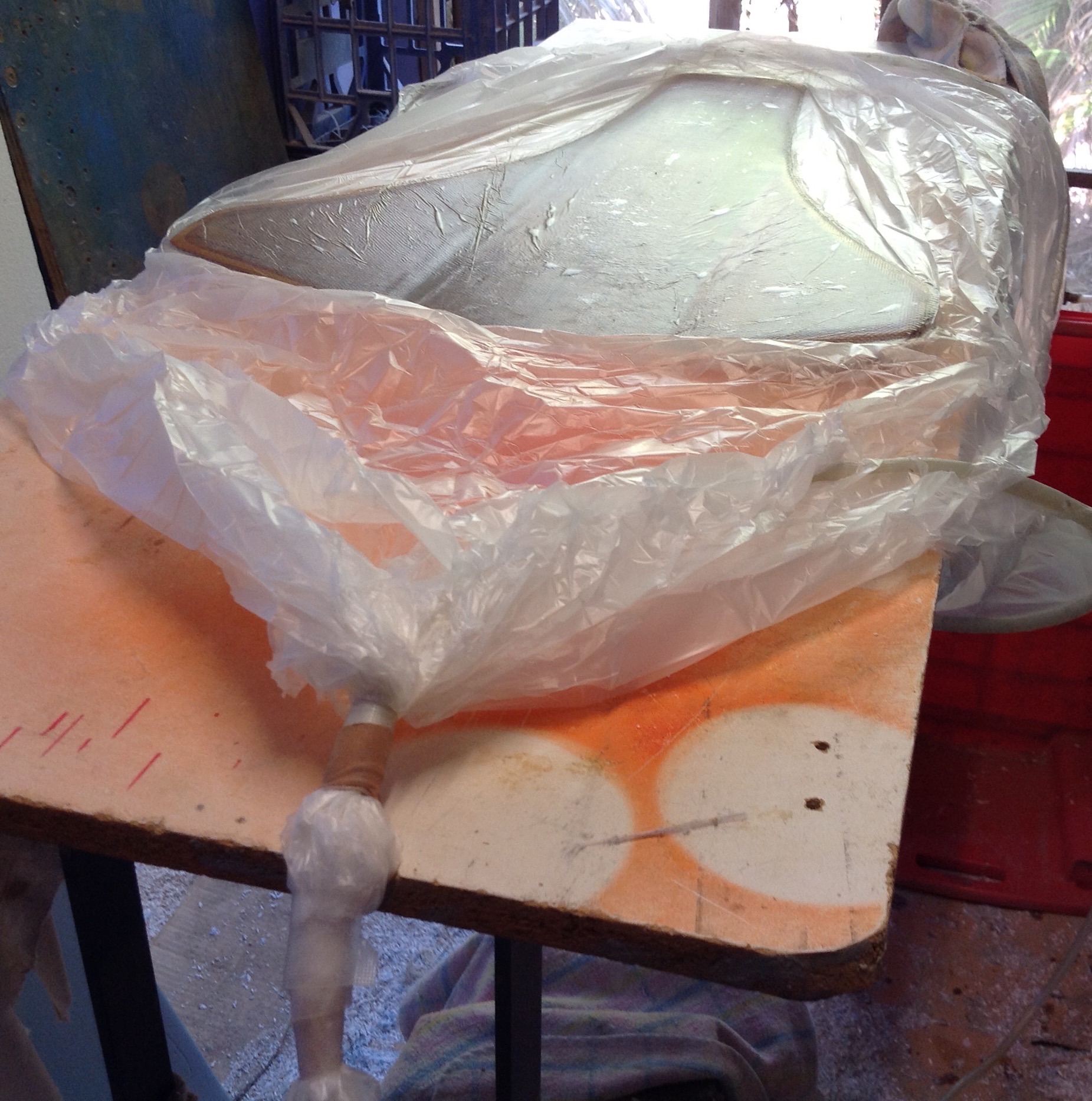 The pump sucks the air out of the bag but it also sucks the plastic and the glass on to the ply and draws away excess resin so you end up with a glass job that sticks exactly to the shape and doesn't carry excess resin that makes it heavier than it needs to be. You only throw away a plastic bag and a bit of sticky tape and there's no resin to clean up or scrape off the floor like standard laminations.