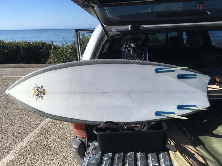 I’m still riding the 5’ bat-tail quad, used a lot less since the pandemic began, the crowds became out of control plus a heart attack two years ago, from which I’ve recovered. But a new Wayne Rich 4’10” single fin, 19” wide, really thin, has me re-stoked. Got some west Goleta sneak attacks in at the end of spring, beginning of summer. Another fast lane flyer!!