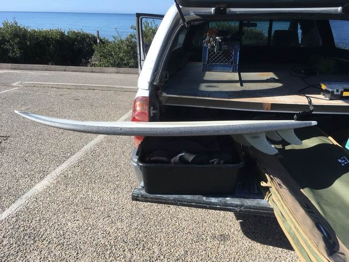 anything to keep us on the ocean, right? All my boards have a dish starting a few inches above the midpoint and fairing off into the tail where the thickness is just enough to account for the fin boxes.