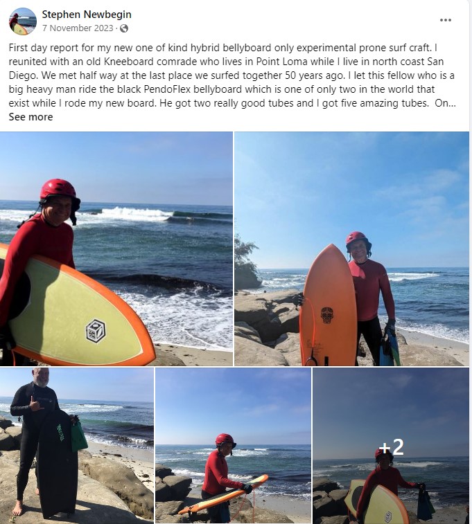 First day report for my new one of kind hybrid bellyboard only experimental prone surf craft. I reunited with an old Kneeboard comrade who lives in Point Loma while I live in north coast San Diego. We met half way at the last place we surfed together 50 years ago. I let this fellow who is a big heavy man ride the black PendoFlex bellyboard which is one of only two in the world that exist while I rode my new board. He got two really good tubes and I got five amazing tubes. Only regret is we did not have someone doing video or taking pictures. My board was configured with standard three black fiberglass fins made by Fins Unlimited with middle full foil fin in center of the box and two fiberglass future fins by same company as a match side set all exceeded my expectations. Kind of hard calibrating fin set ups when you are flying down a vertical face and turning under the tube and able to cut back with ease. I will retire the rest of my quiver for now because this board is no dud. Mitch told me the black board was the best board he has ever ridden prone. We took these photos after surfing and the surf had started to shrink from the earlier sets.
