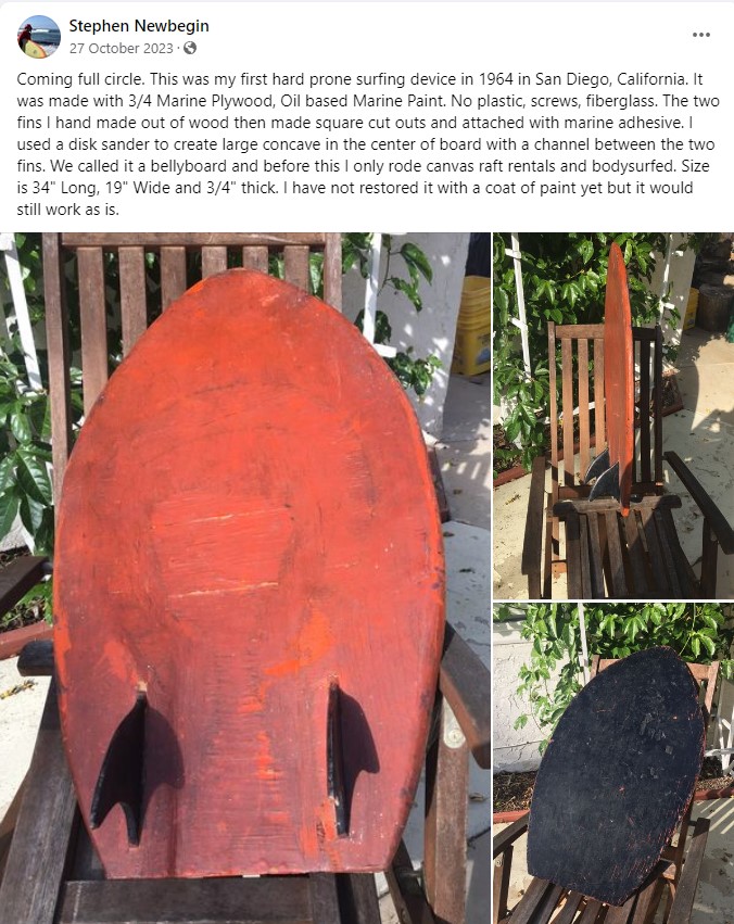 I think I was still kneeboarding in 2009. My orange recent board shaped by Barry Snyder may have pictures at his web site of the deep sternum pit I had put in before using Stevie Pendarvis black material to fill it in flat with board top. This would have saved injury for you and friends like Bird Huffman. I chose to do this because soft decks are not enough and vests are fine for big wave surfers but too restrictive for belly riding. Wish you good luck with your patent in spite of my attitude against them. Creativity has many levels so if my comments don't apply to you don't take it personally. I was one of the people in the shaping room when Morey and Doyle shaped the first soft surfboard so I am glad you enjoyed. Tom Morey realized he had to sacrifice performance to make these all foam boards including boogie boards to reach the mass market. However, I was one of the judges at the first boogie board contest so its not like I don't understand bodyboards. However, the only thing I tried at his factory there was in the mid/late 70s was filling up a shell with boogie foam and skin. This board originally I had added two outside glassed side fins to the existing glassed single fin. This was the first tri-fin on a sub 5ft board I know of. Technology has always been a blessing and curse at the same time. What is ironic to me is Nikola Tesla who was ripped off by Westinghouse is that Elon Musk is using the blessing and love of innovation of Tesla with the crony capitalism of Westinghouse. He does patents so he can trade with other big players with patents in his way. Cars and Rockets are easy compared to complex systems in nature like surfing. Again, good luck to you.