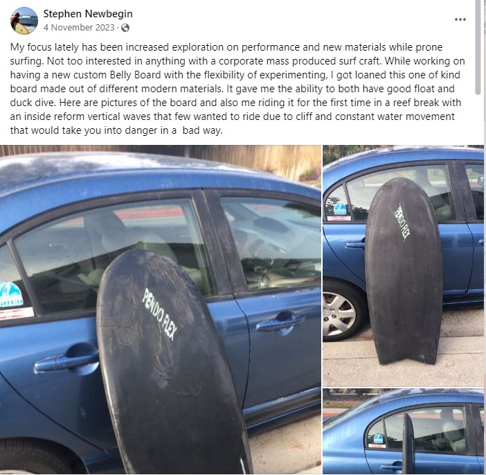 My focus lately has been increased exploration on performance and new materials while prone surfing. Not too interested in anything with a corporate mass produced surf craft. While working on having a new custom Belly Board with the flexibility of experimenting, I got loaned this one of kind board made out of different modern materials. It gave me the ability to both have good float and duck dive. Here are pictures of the board and also me riding it for the first time in a reef break with an inside reform vertical waves that few wanted to ride due to cliff and constant water movement that would take you into danger in a bad way.