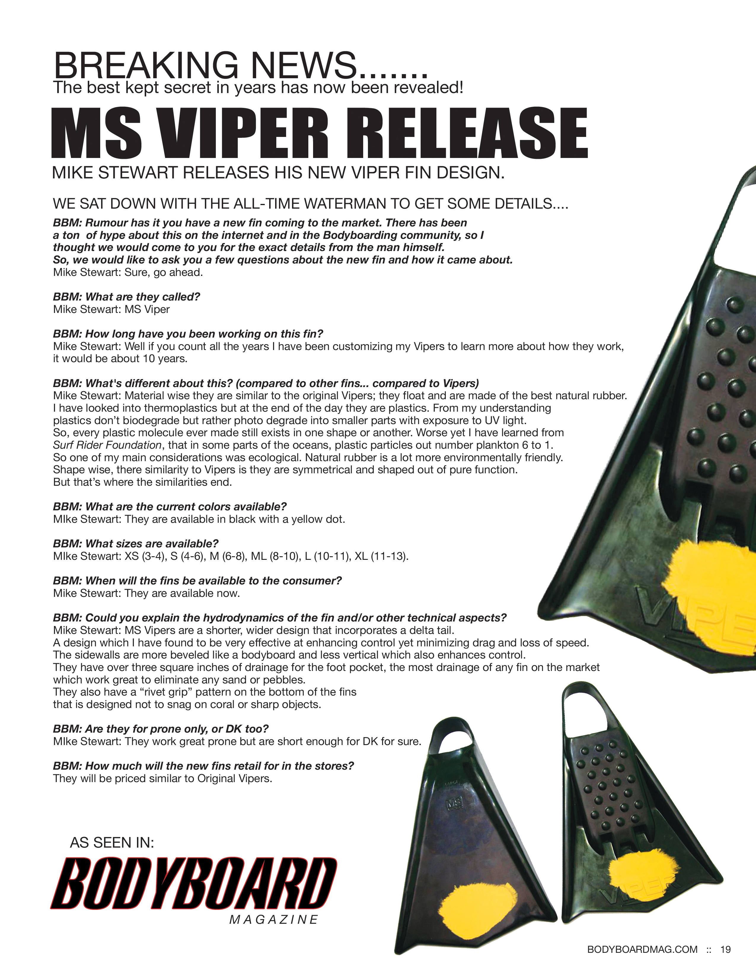 I've been using Viper V-5 yellow dots for the last 2 years I've gotten back into riding paipos. I agree with Rod's comments about the noticeable difference when using the yellow & orange dot fins in different climates. I find the yellow dots work well in the water temps I usually surf (mid 50's avg year round) when I'm riding a ply paipo or bodysurfing with my legs starting the kick mostly well below the surface. When riding a bodyboard or similar in cold water with legs elevated just at the surface or above, it seems that more effort is required for the down kick than I prefer. The orange dots I was using before for bodyboarding seemed more comfortable. I had the opposite experience using the yellow dots in Hawai'i the past week. Felt more comfortable on the bodyboard, but seemed to require much more kick effort on the paipo or bodysurfing. My surf time was very limited though, and there was usually a lot more fine food & alcohol digesting in my system than I'm used to.