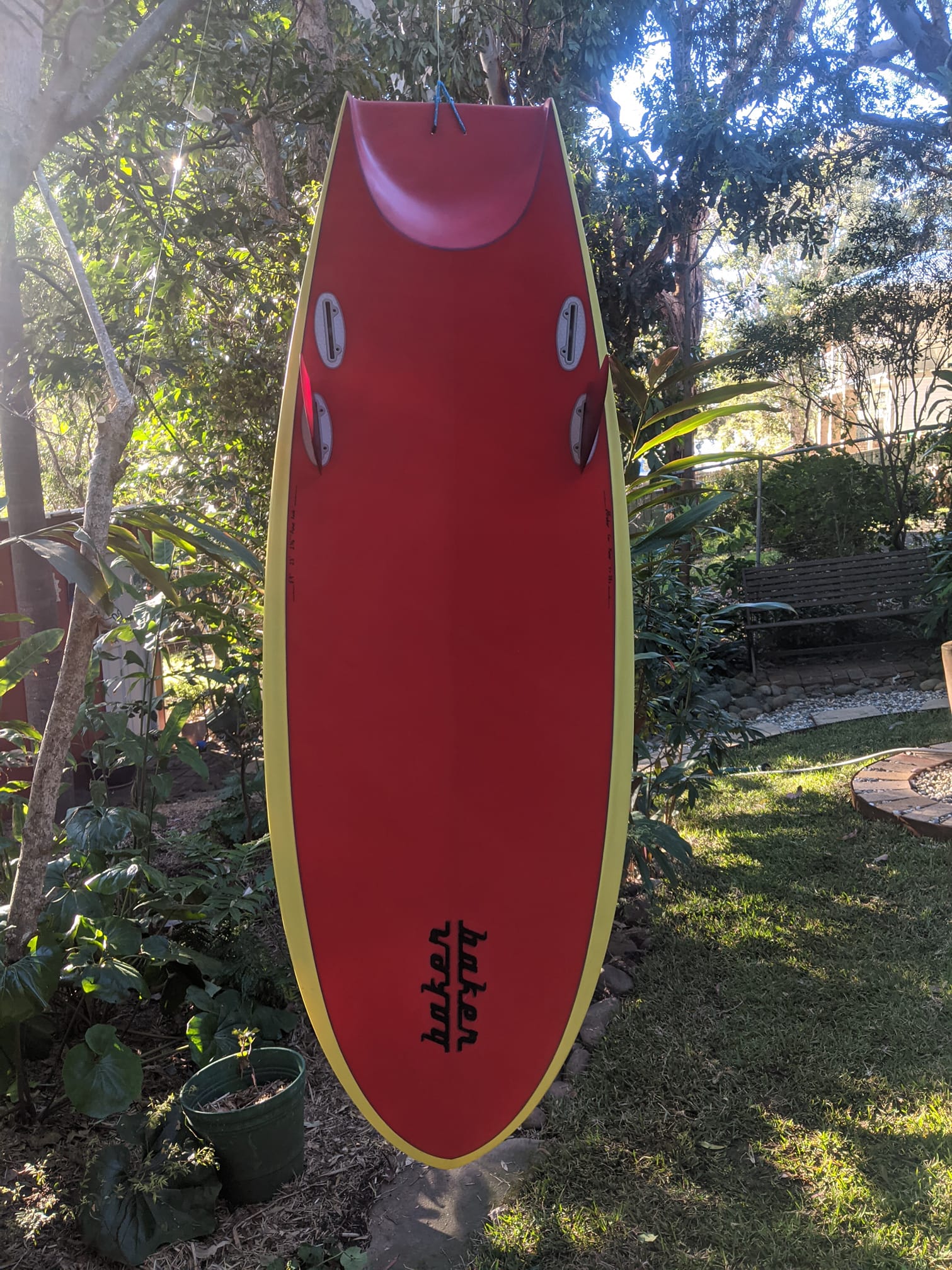 A Baker edge bottom flex tail designed to cope with a lumpy, bumpy offshore reef wave. Glassed heavy and strong to cope with a beating. As Andrew Kidman says in The Edge Of A Dream about an edge board called Pink " the more onshore and rogue the conditions get the faster Pink goes". The book is definitely worth a read and the DVD is fascinating.