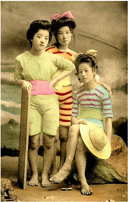 2) My own suspicion is that, judging from the bathing suits the two girls are wearing, this image dates from the late teens at the earliest and might even be from the early 1920s. That they also have traditional elaborate Japanese-style hairdos suggests it's not from too much later, because short hair became popular in Japan for young women by the middle to late 1920s. But the point is, I do not think the photo is from 1903.