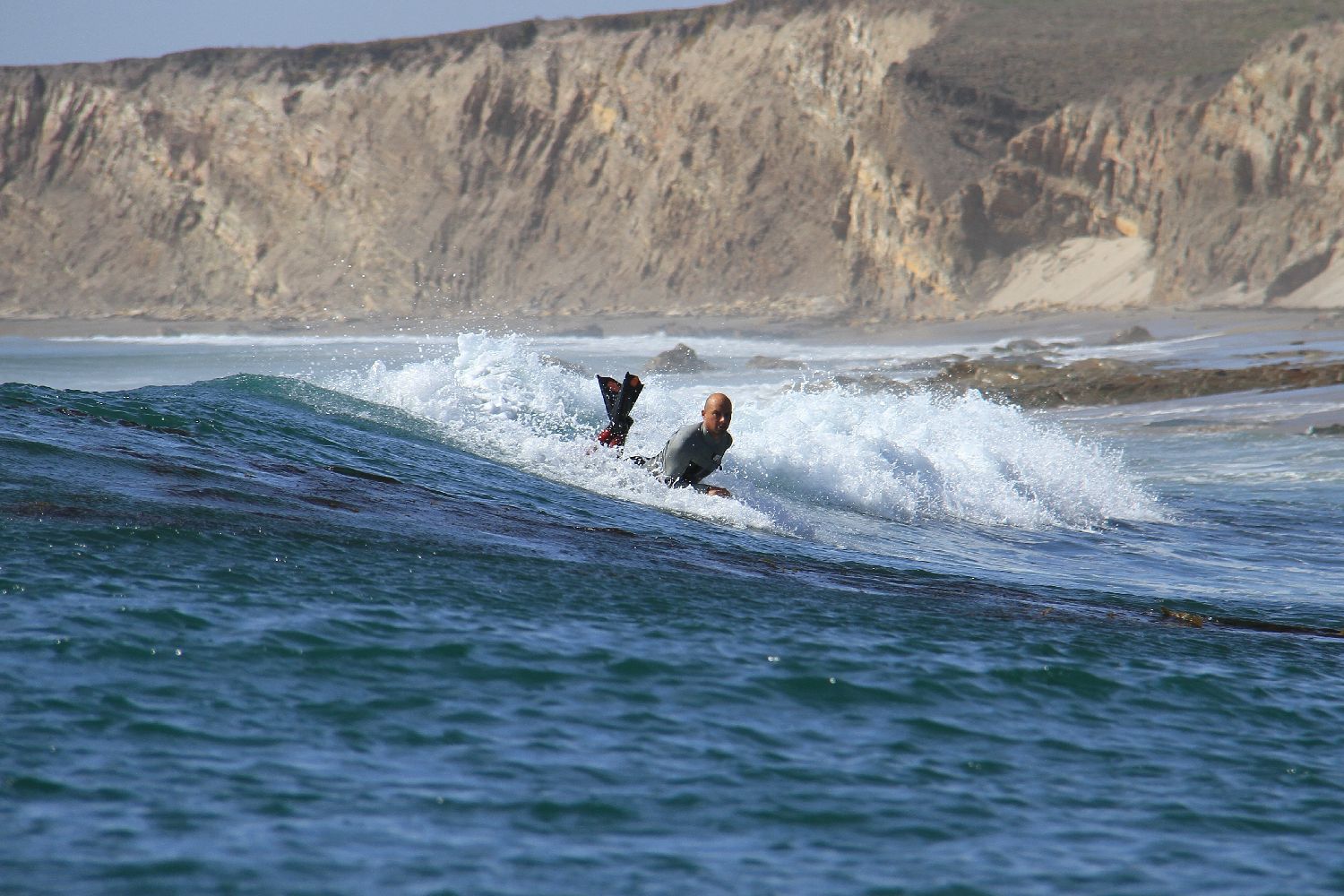As for the surfing part.........I position myself for an incoming wave, and at the last moment, when the wave is maybe 6' or so behind me, with a kick of my Da Fins, I pop up onto the top of the board, the wave slides underneath me.............and I use my arms for paddling and kick my fins to propel myself into the wave. After many years of experimenting, this system has proven to be the most comfortable, ergonomic, most successful way to get around and catch waves on my boards.