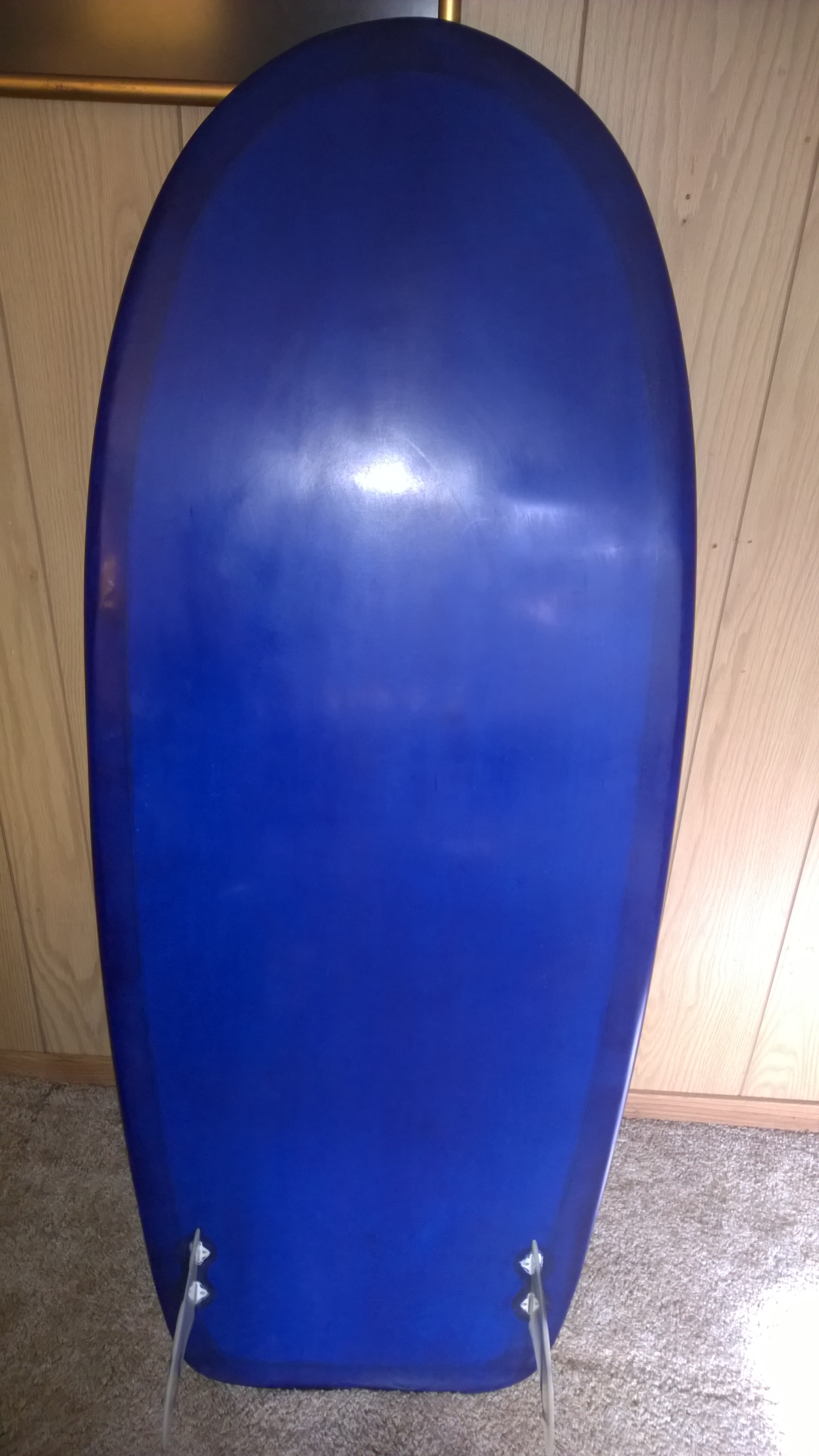 Here are some photos of my latest board. Hopefully the photos aren't too big. The specs are 51 1/2" long, 21" wide, 1 3/4" or so thick. It is epoxy with 3 layers of 4 oz top and bottom. I am planning on putting a Cove pad on it --either 3/16" or 5/16". But first I am riding it awhile without a pad. I rode it in some decent surf on Sunday at Ocean beach in SF and some crummy surf the day before. It seemed to ride great.