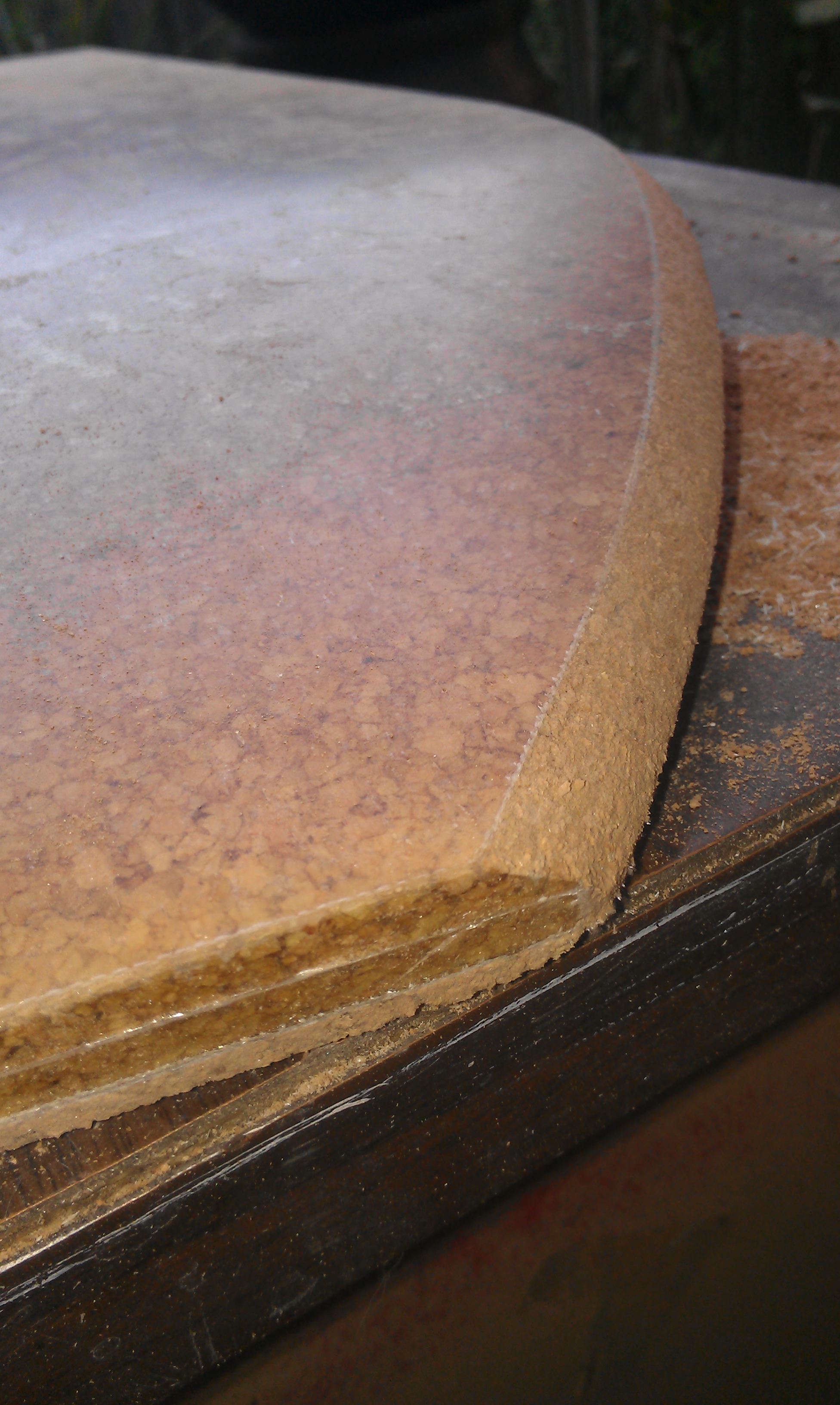 I tried a few different things with the dorsal bump, and eventually landed on the design we have now - a 9.5" x 36" fiberglass-encapsulated cork panel embedded inside the board. I use a lower density cork for the bump to save some weight.