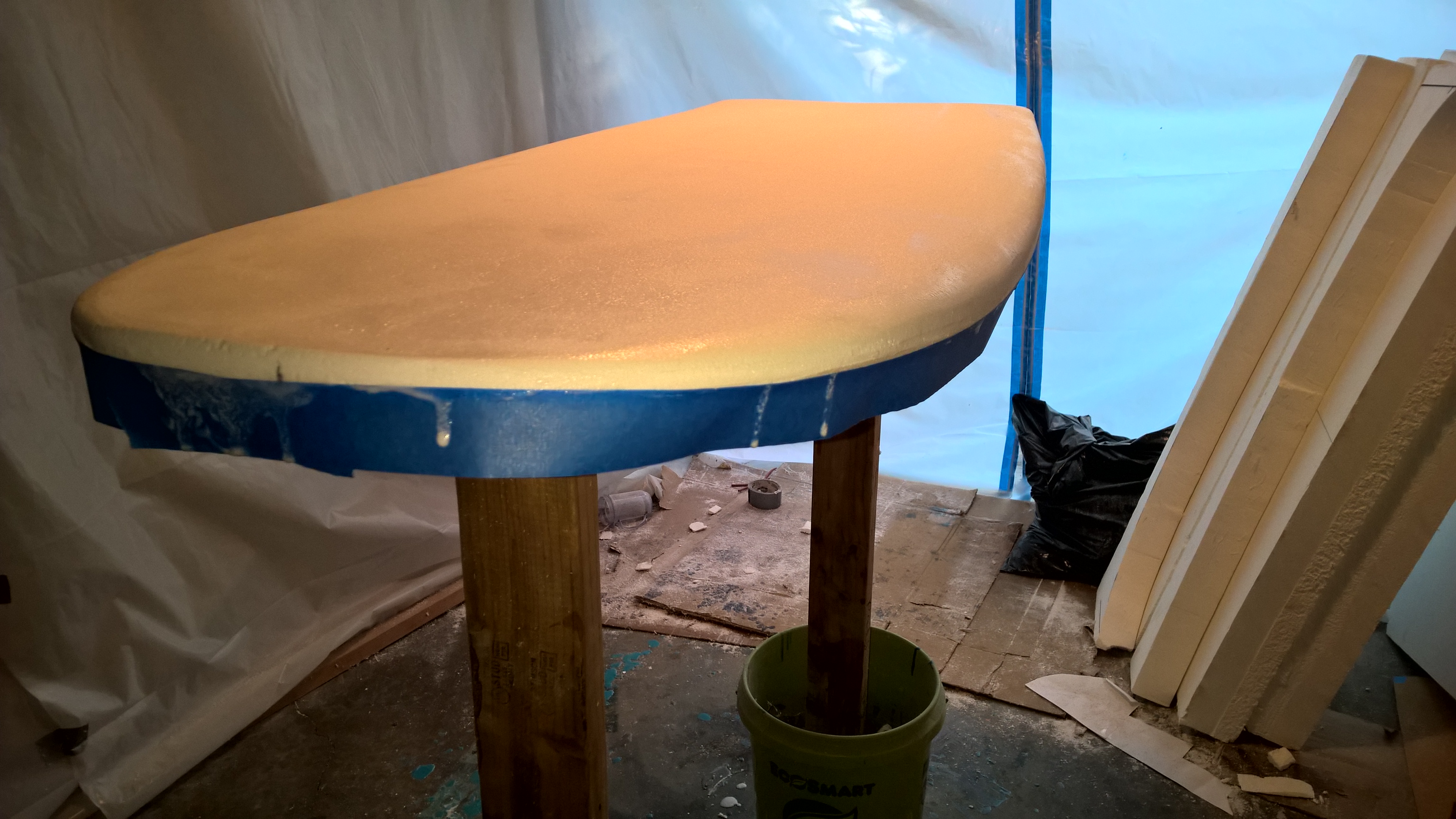 Here are some photos of my build: This is picture the top being sealed with epoxy and Microballons . Now I have sealed both sides and I have the FCS Fusion fin boxes in and have laminated the bottom with 2 layers of 6 oz cloth. Here I have taped off the bottom so I can do cut laps