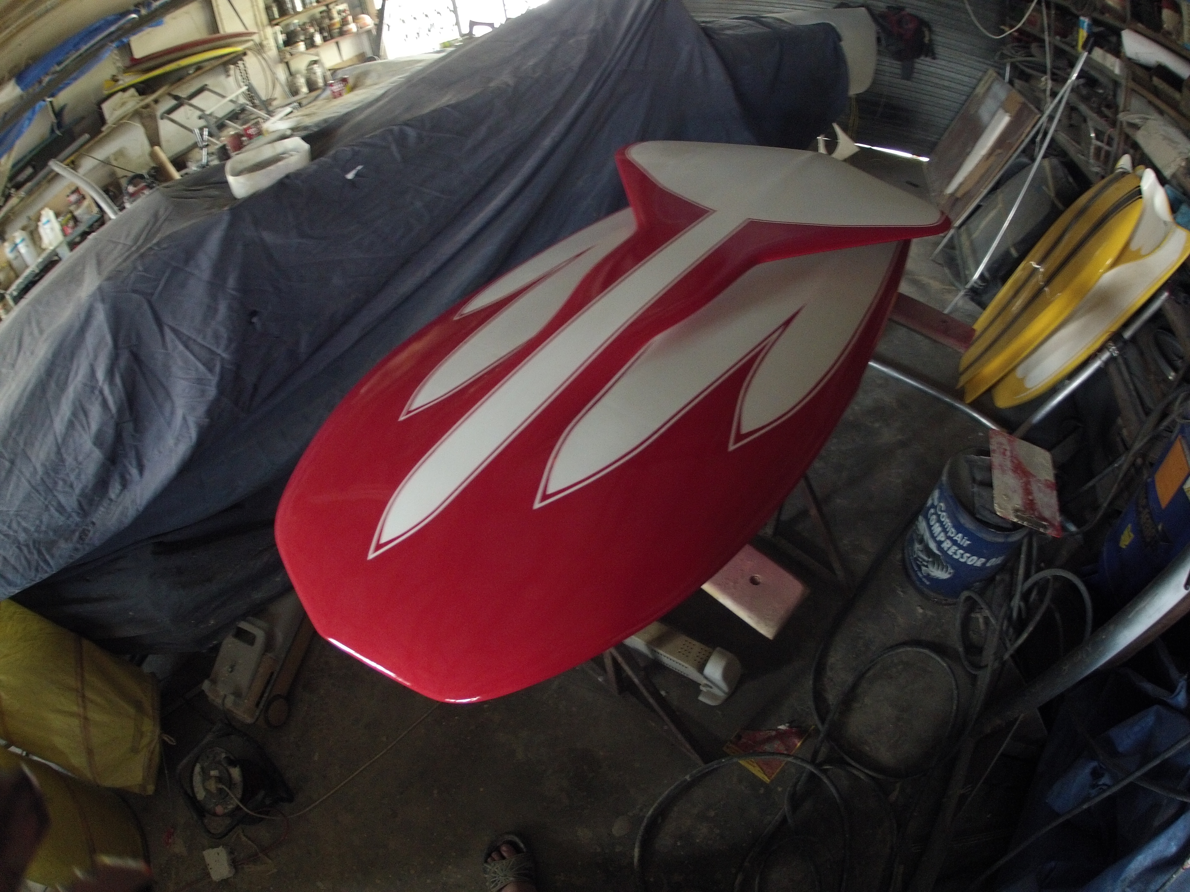 It is hard to explain the main hull sits up but with the wake foam ball touching the rail, mostly it runs with one rail and one fin in steep walls, at very high speeds it gets up on one wing tip, shaping is not that difficult the main parts are foam laminates with the main concaves and rockers pressed in. The fin is built separately a foam laminate with corrugated spars .