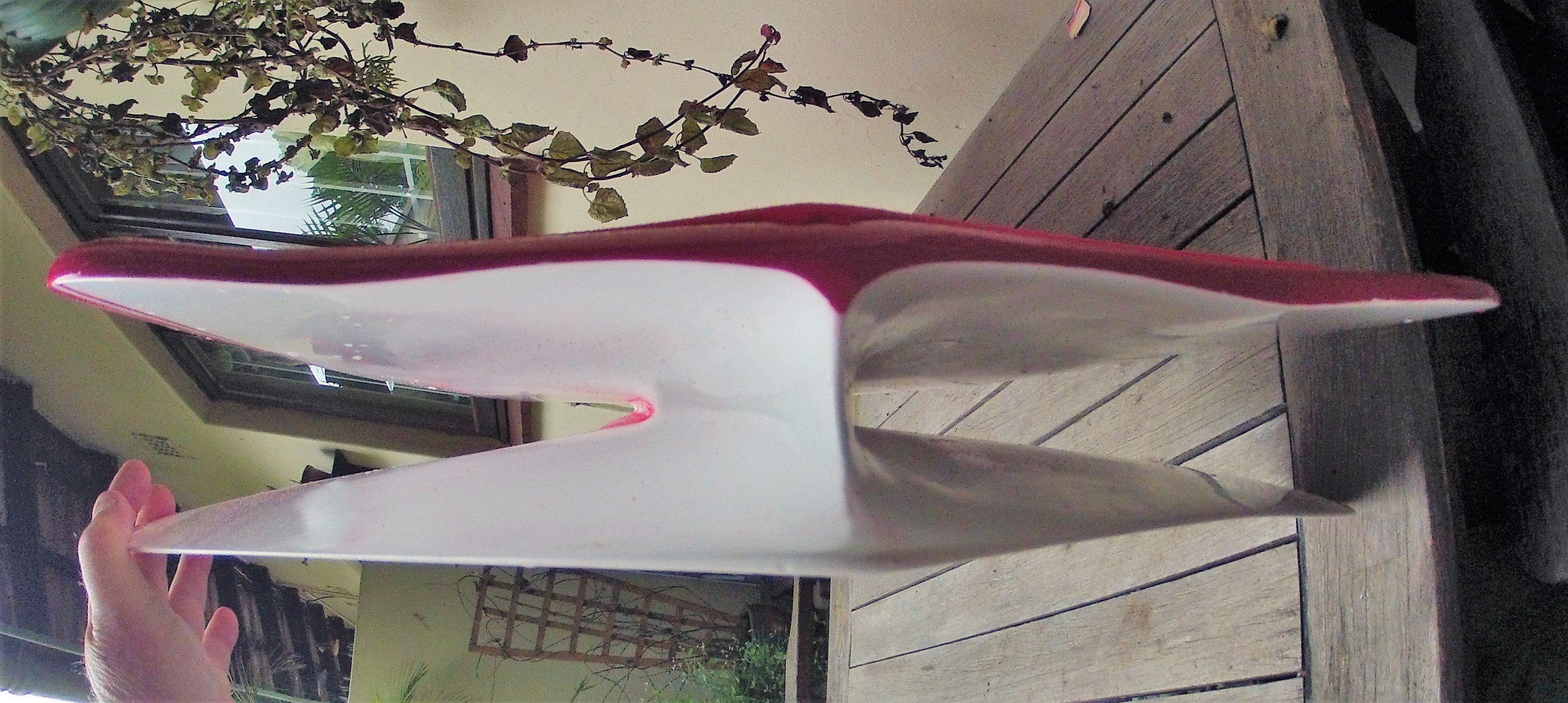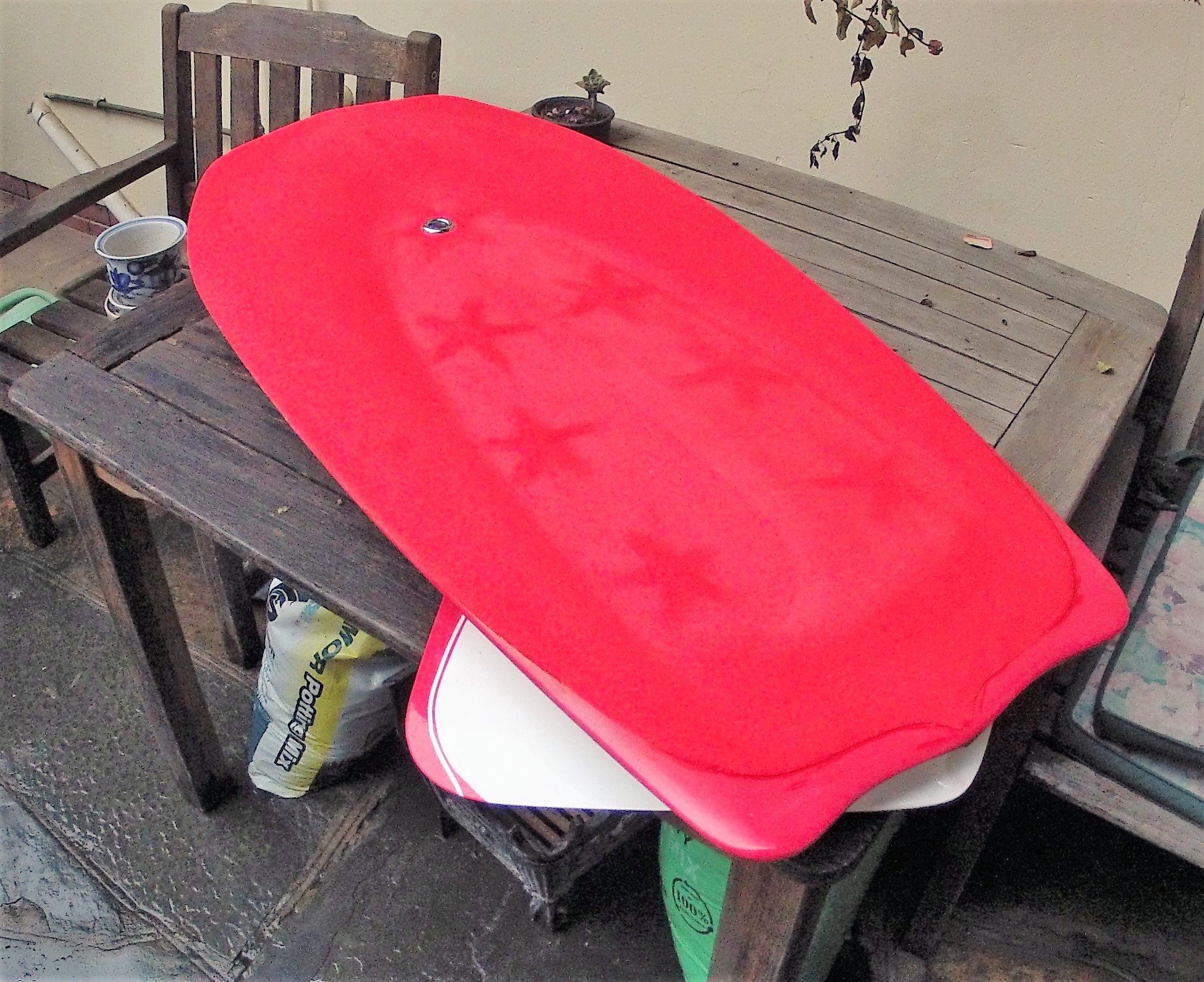 After going through a short small board faze and having some of the beast waves of my life on the black board .And after some deep reflection on witch of my ‘’ can you make a better body board ‘’ experiment s is best , here is another stab in the dark . this will be the last red board , I have used up all my red foam .Because funds are running dry quality was compromised buy using off cut bits off foam, the join lines show when the board heats up a bit. And unexplained bulges are suggesting water in the foam. I have learnt my lesson. But I will use the board as is , I am looking forward to the first teast ride